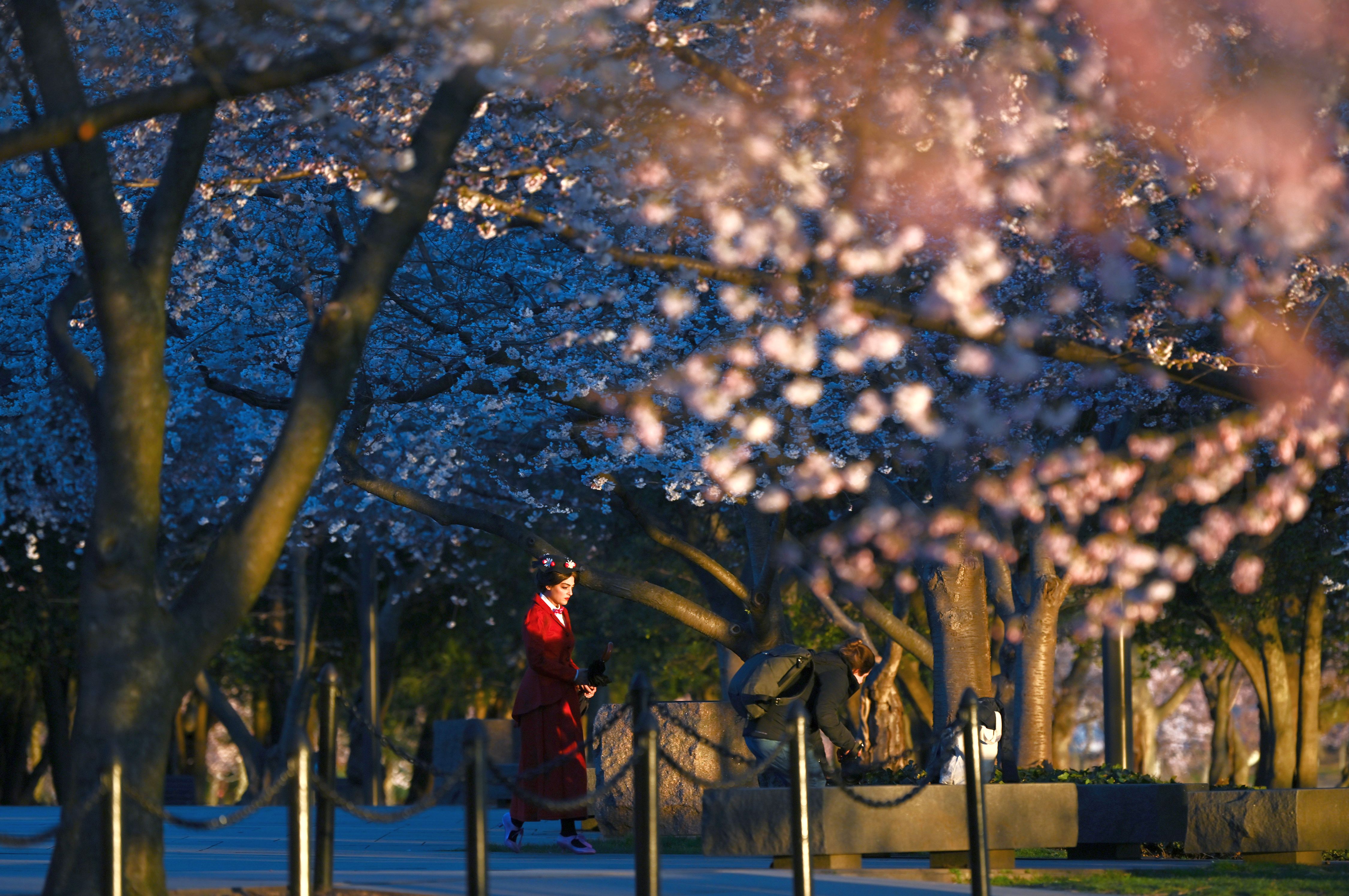 A pedestrian walks near blooming cherry blossoms not far from the Tidal Basin on Monday March 20, 2023 in Washington, DC. The blossoms are nearing peak bloom. (Photo by Matt McClain/The Washington Post)