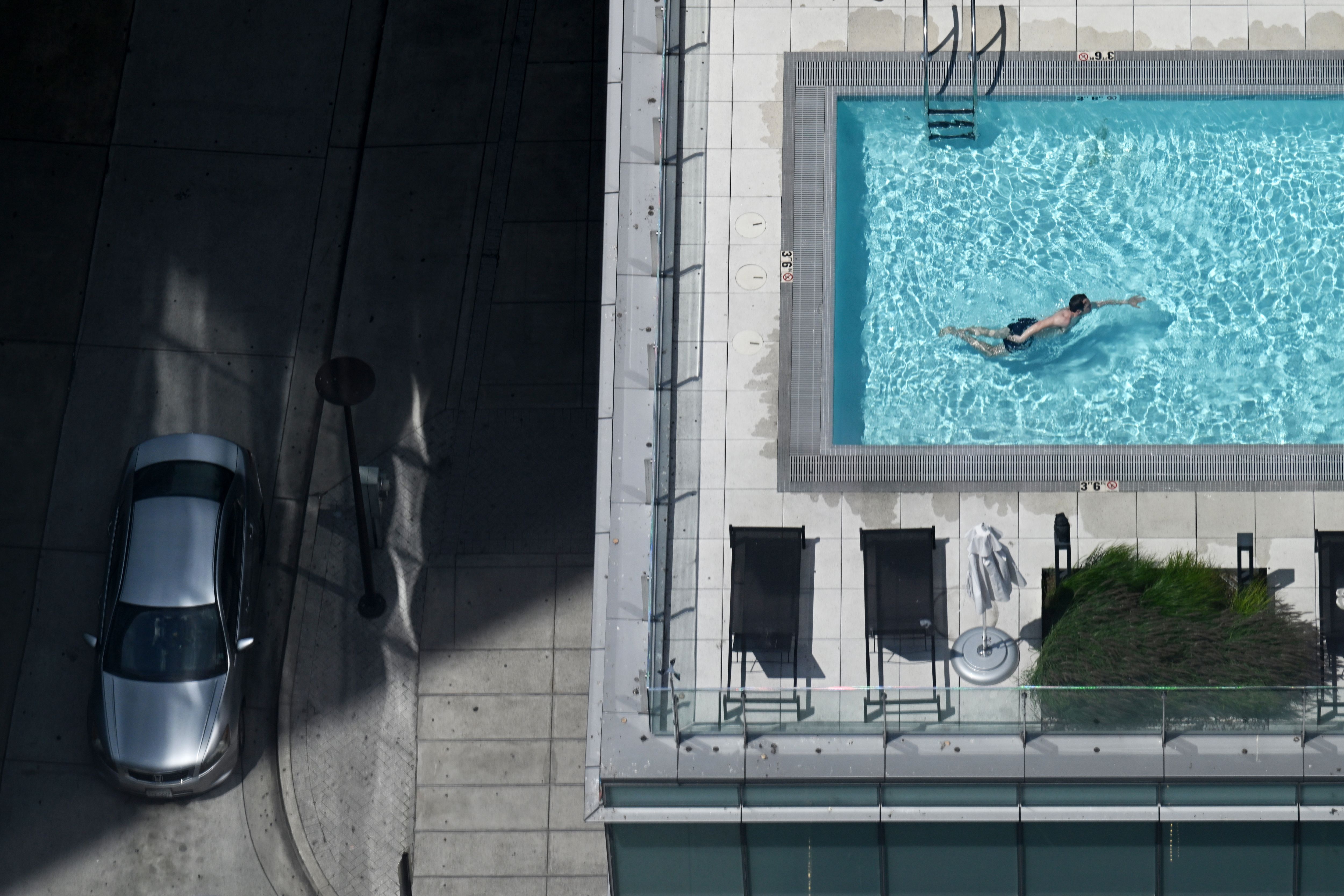 A swimmer cools off in a pool as the street below is seen at left on Sunday June 9, 2024 in Arlington, VA. (Photo by Matt McClain/The Washington Post)