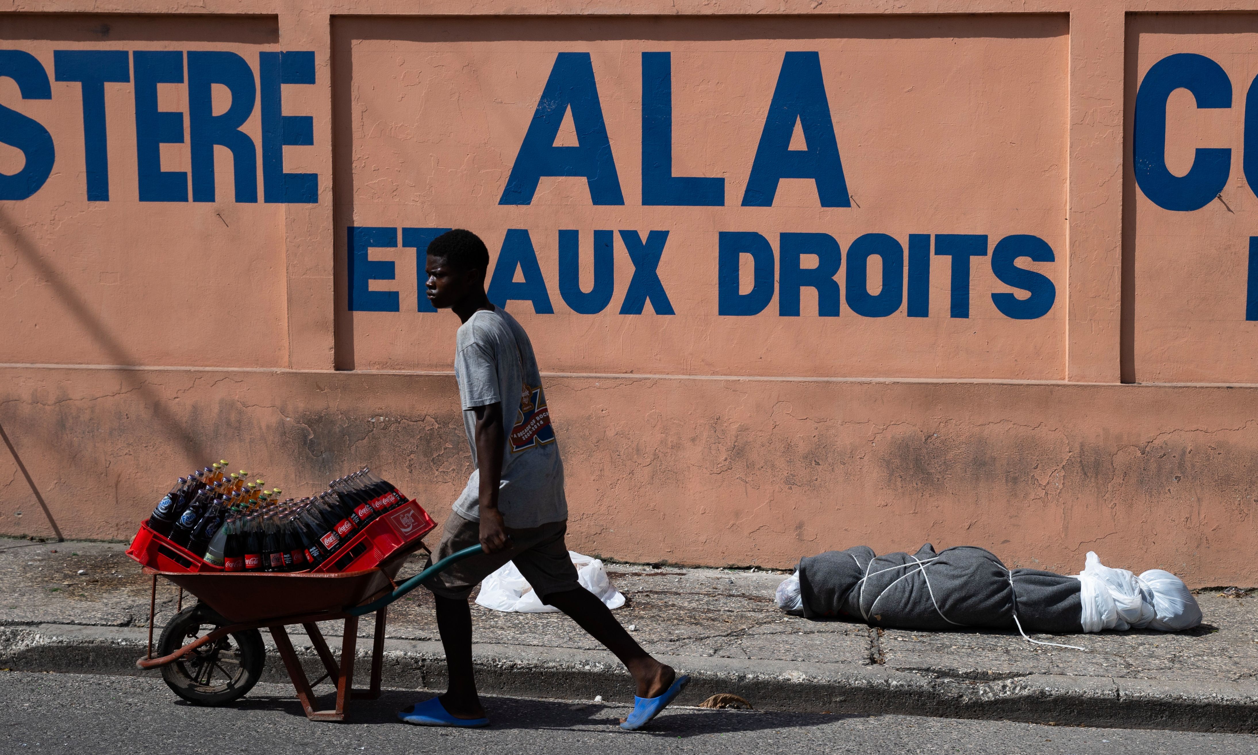 People walk in front of a body which was left wrapped in plastic and tied, on a street near the National Palace in Port-au-Prince, Haiti, 27 May 2024. According to the United Nations Integrated Office in Haiti, last year alone, violence caused at least 8,000 victims in Haiti, where gangs control much of Port-au-Prince and other areas of the country. (Photo by Orlando Barría/EPA/EFE)