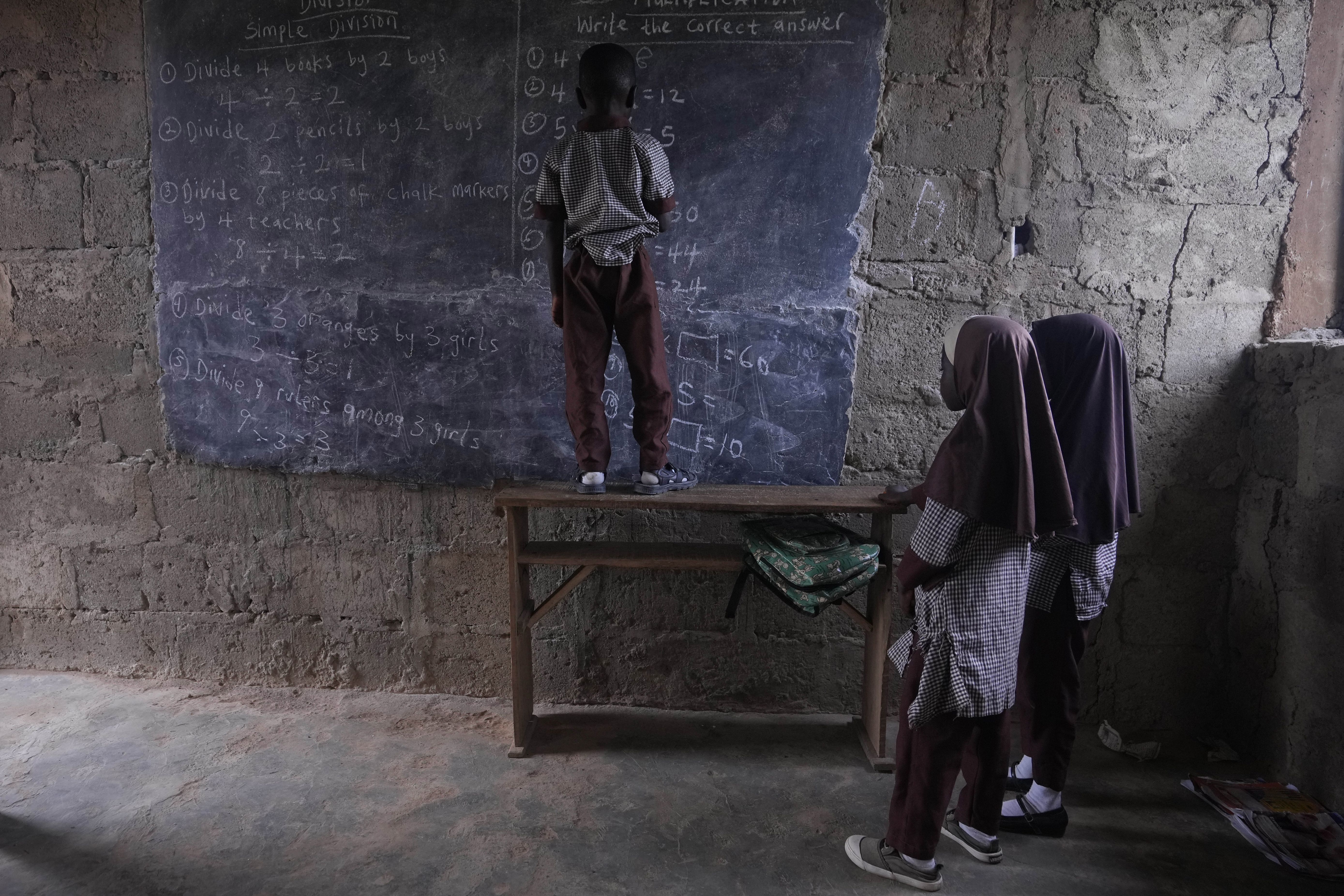 Students work out math problems on a blackboard inside a classroom lit by sunlight that streams in through the windows and doors, at the Excellent Moral School that has no access to electricity in Ibadan, Nigeria, May 28, 2024. (Photo by Sunday Alamba/AP Photo)