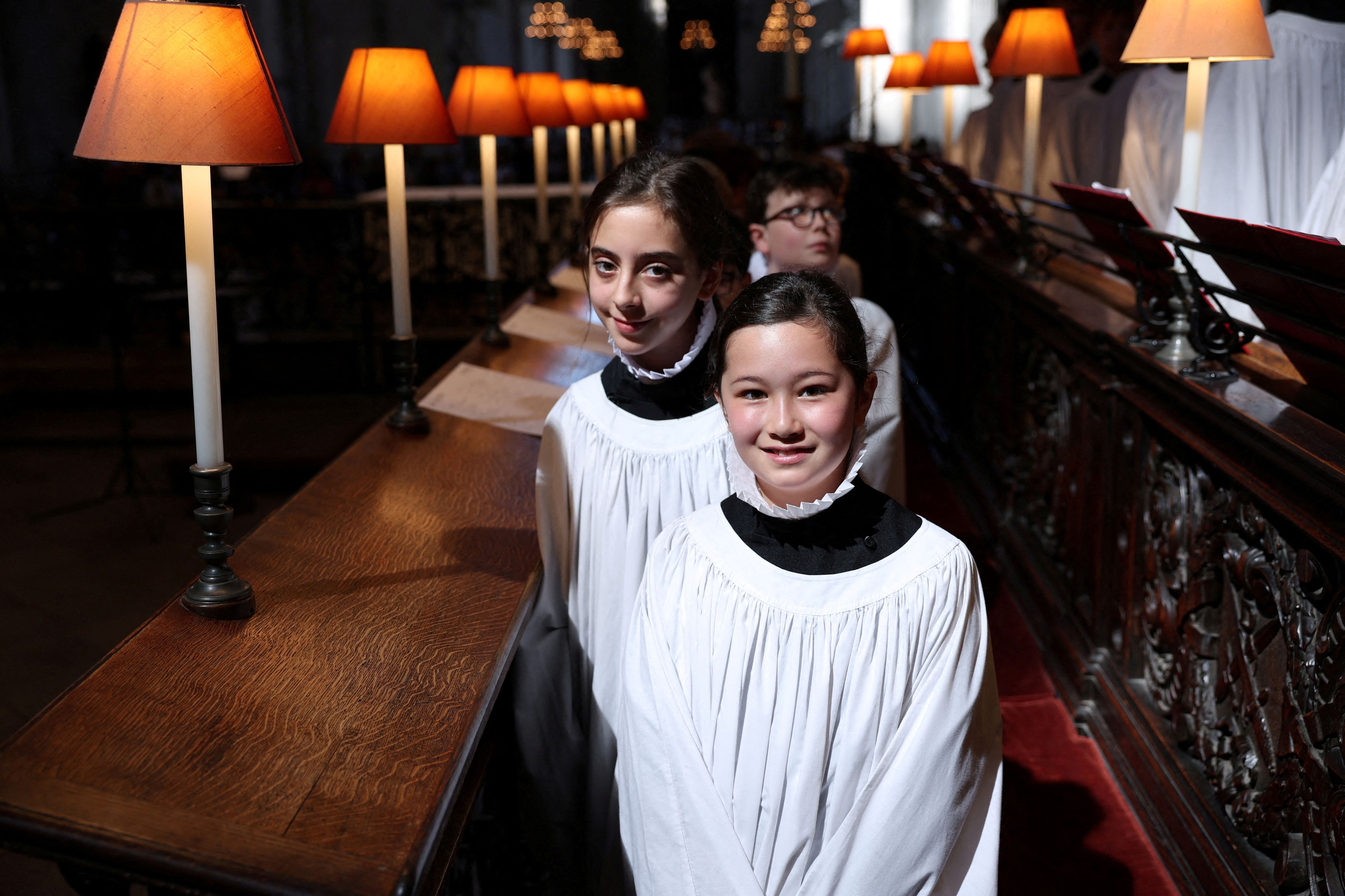 Girl choristers Lila and Lois pose for a picture as they are to become full members of the St Paul’s Cathedral Choir for the first time, in London, Britain, on June 29, 2024. (Photo by Isabel Infantes/Reuters)