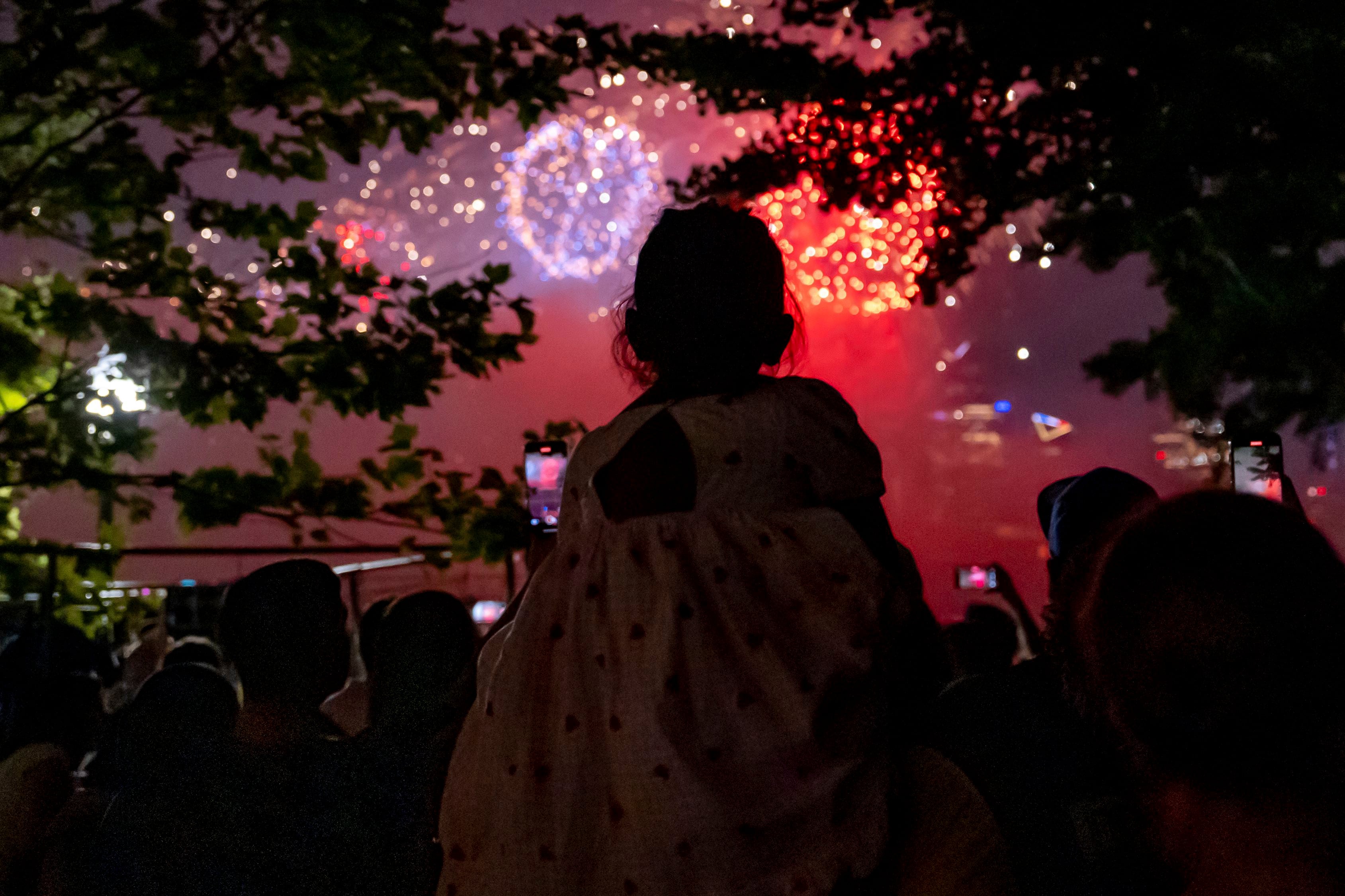 A girl watches Macy's Fourth of July fireworks over New York, Thursday, July 4, 2024, in Hoboken, N.J. (Photo by Julia Nikhinson/AP Photo)