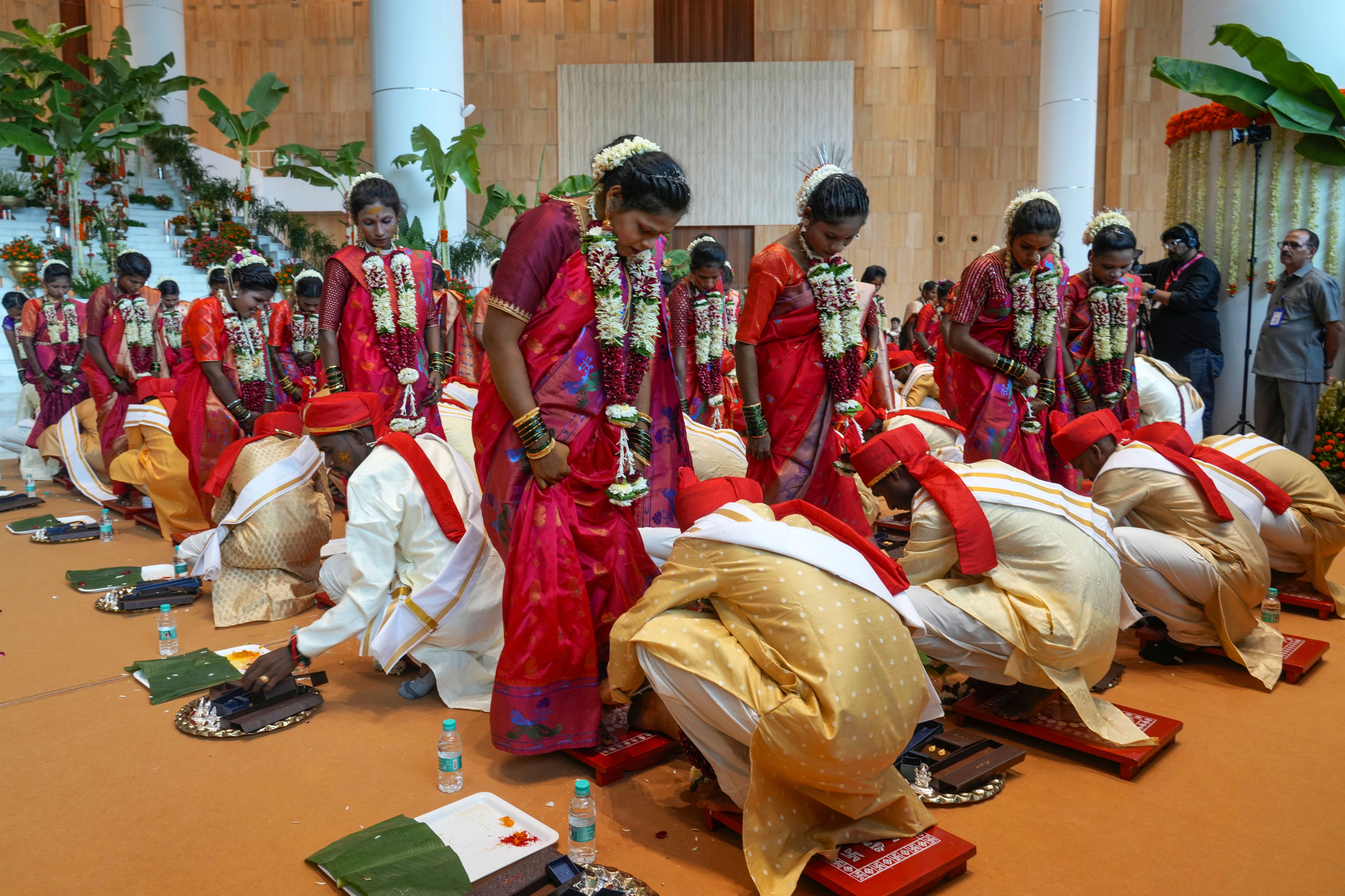 Underprivileged couples take part in a mass wedding organised by Chairman of Reliance Industries Limited Mukesh Ambani as the part of pre- wedding celebrations of his youngest son, Anant Ambani in Navi Mumbai, India, Tuesday, July 2, 2024. (Photo by Rafiq Maqbool/AP Photo)