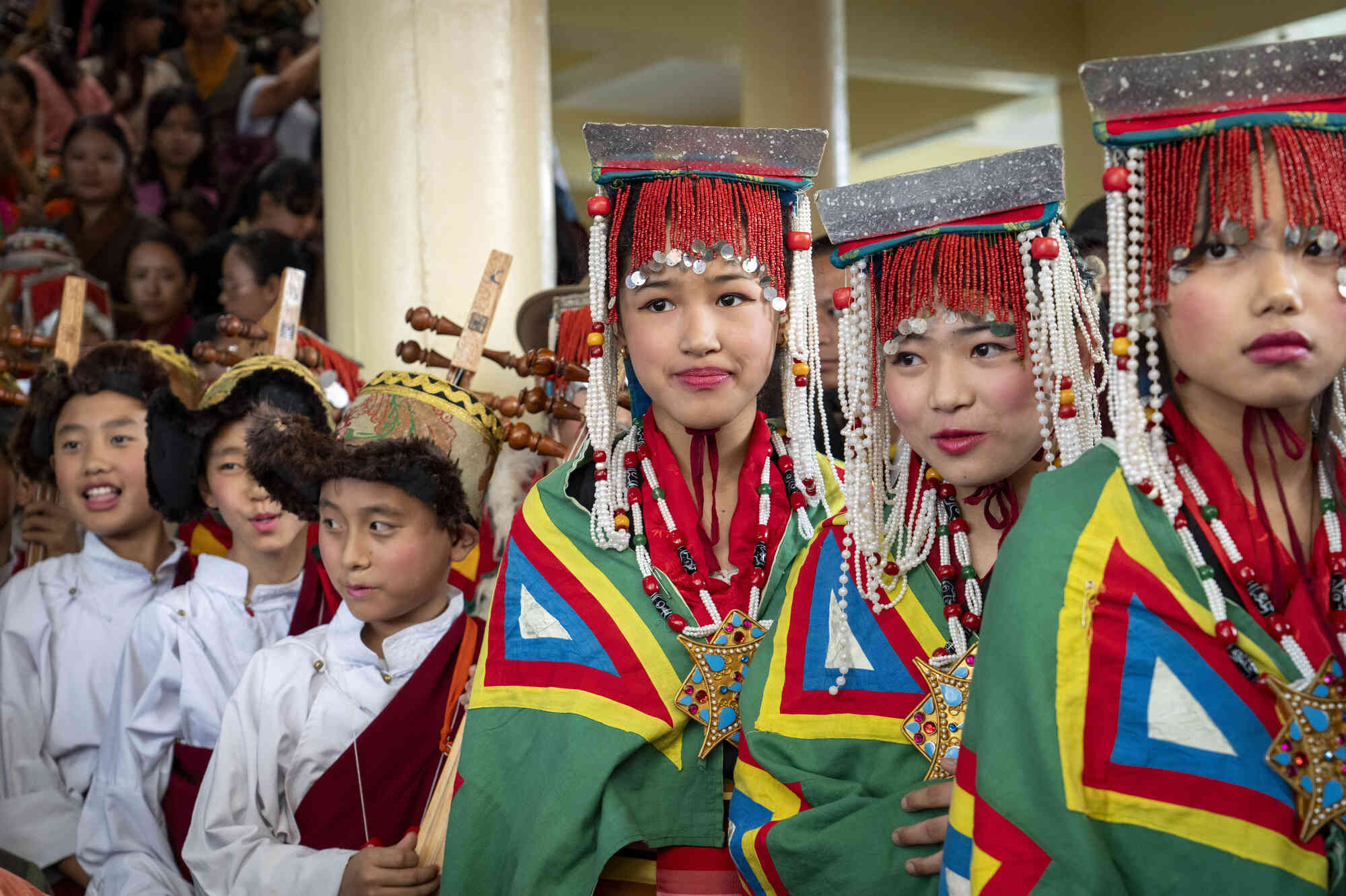 Exiled Tibetans in ceremonial outfits wait to perform a traditional dance at an event to celebrate the 89th birthday of Tibetan spiritual leader the Dalai Lama at the Tsuglakhang temple in Dharamshala, India, Saturday, July 6, 2024. (Phoot by Ashwini Bhatia/AP Photo)