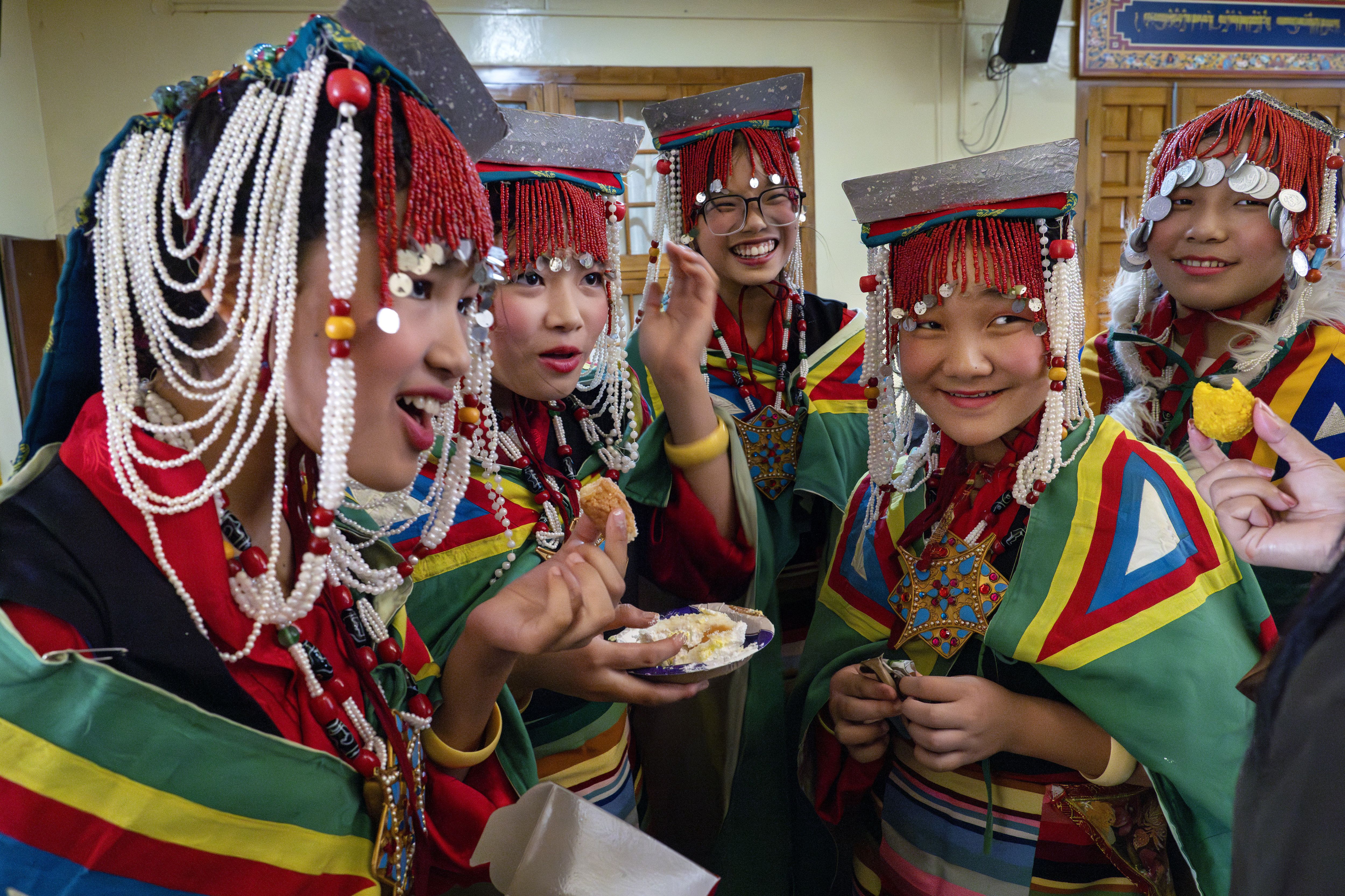 Exiled Tibetan school girls in a traditional costumes eat cakes and sweets as they wait to perform a traditional dance at an event to celebrate the 89th birthday of Tibetan spiritual leader the Dalai Lama at the Tsuglakhang temple in Dharamshala, India, Saturday, July 6, 2024. (Photo by Ashwini Bhatia/AP Photo)