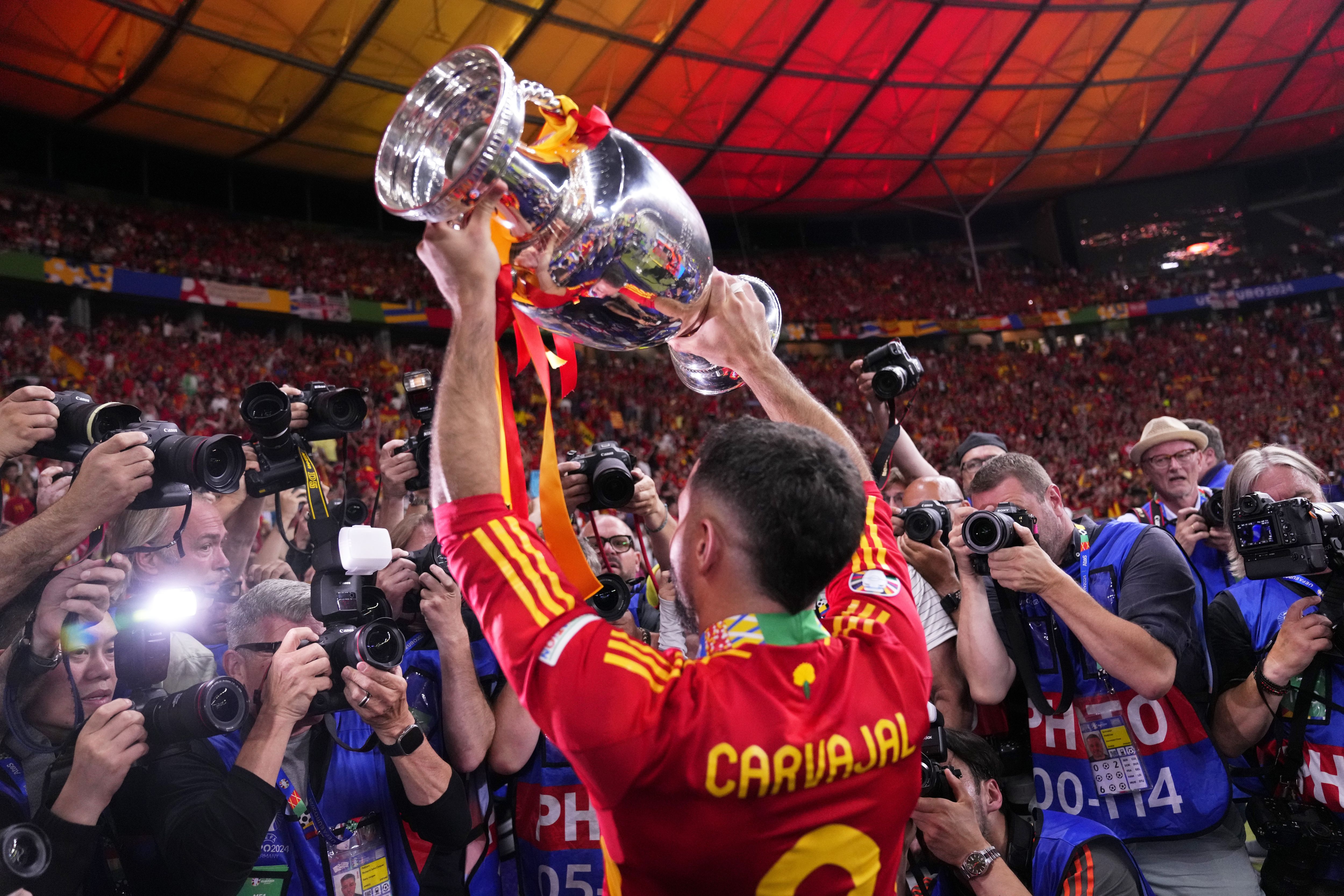 Spain's Dani Carvajal holds up the trophy to the fans after winning the final match between Spain and England at the Euro 2024 soccer tournament in Berlin, Germany, Sunday, July 14, 2024. Spain won 2-1. (Photo by Manu Fernandez/AP Photo)