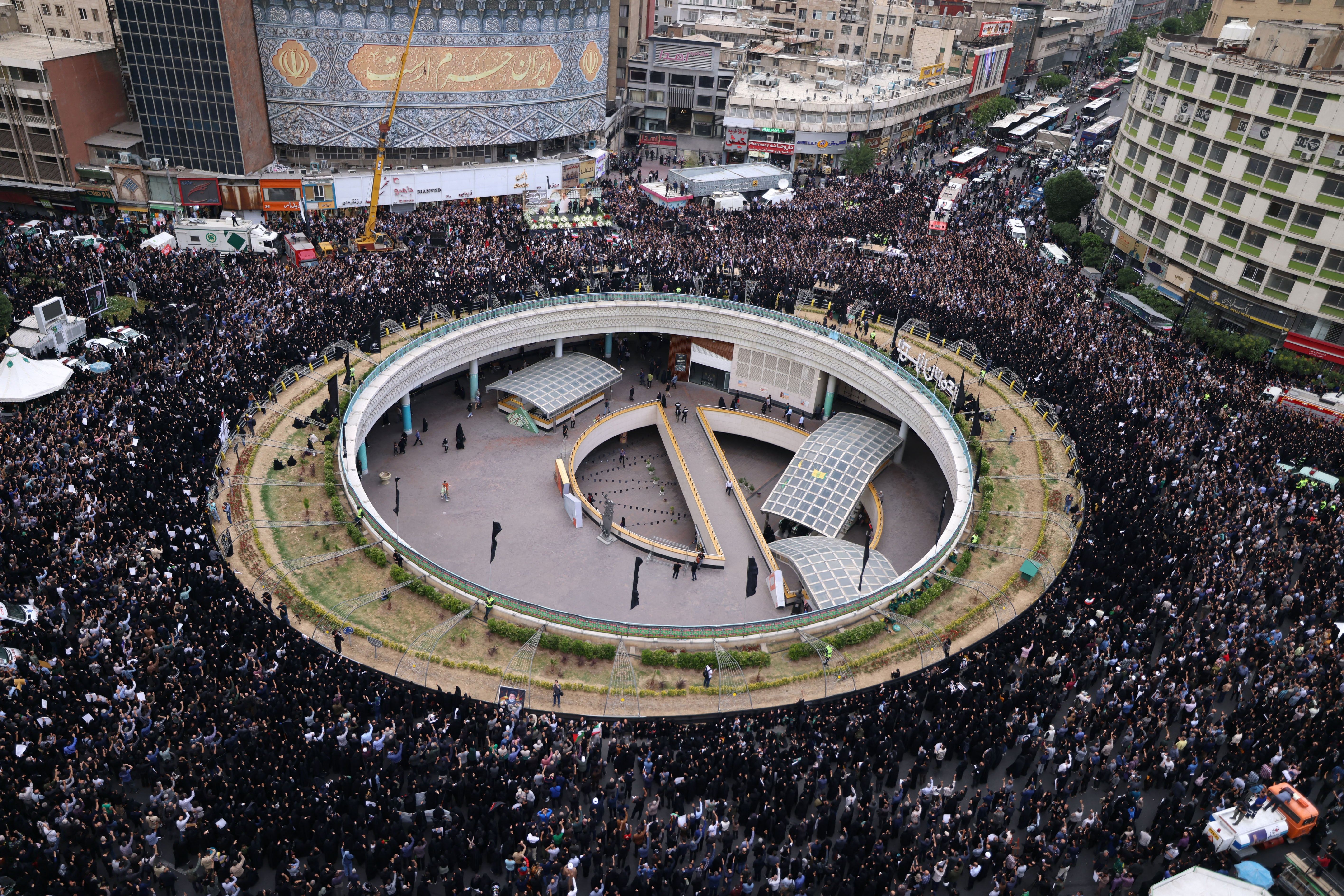 Iranians gather at Valiasr Square in central Tehran to mourn the death of President Ebrahim Raisi and Foreign Minister Hossein Amir-Abdollahian in a helicopter crash the previous day, on May 20, 2024. Iranian president Ebrahim Raisi was confirmed dead on May 20 after search and rescue teams found his crashed helicopter in a fog-shrouded mountain region, sparking mourning in the Islamic republic. (Photo by Atta Kenare/AFP Photo)