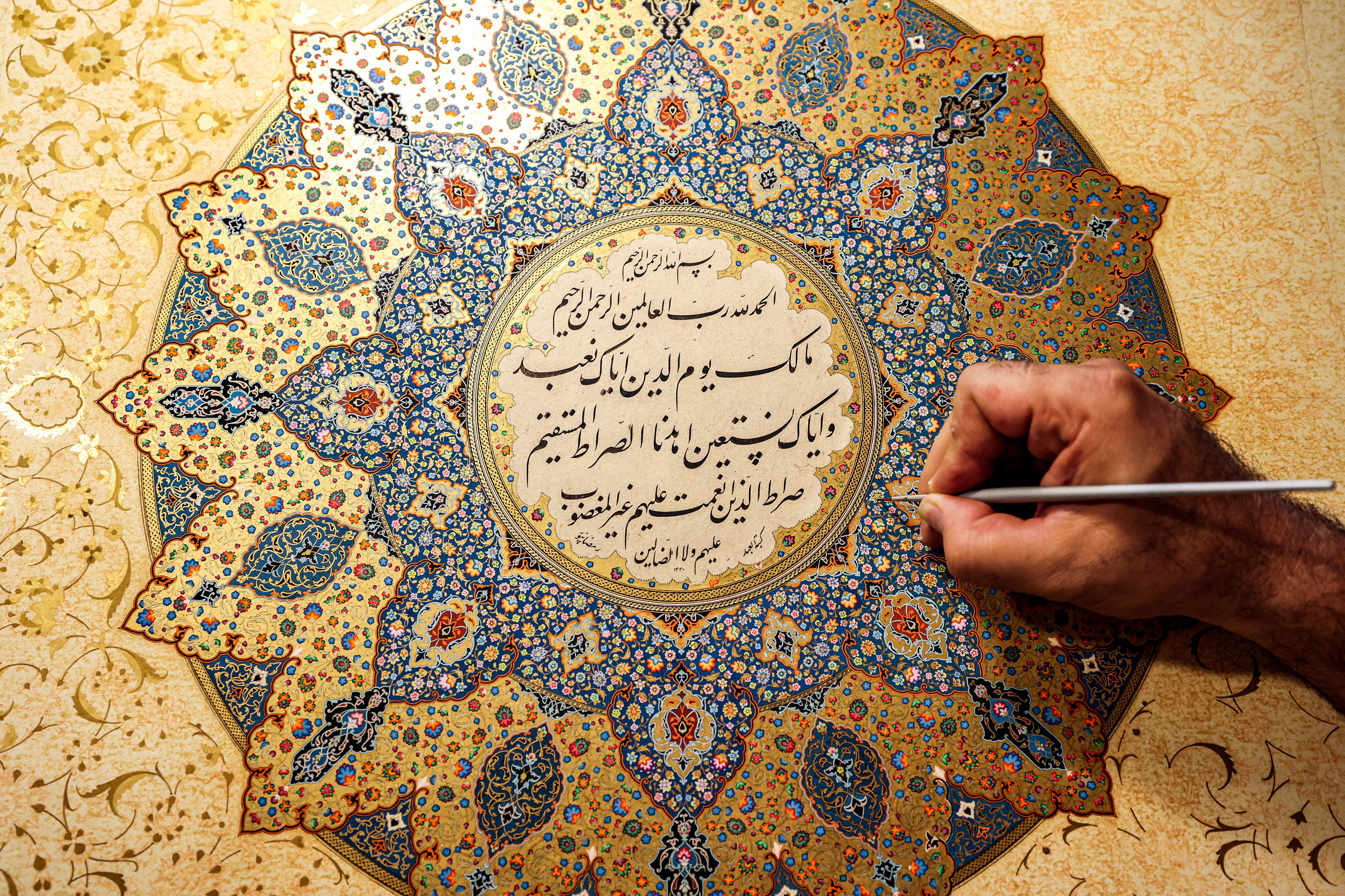 Mohammad Hossein Aghamiri, an artist who specialises in Persian miniatures, works on one of his pieces depicting al-Fatiha, the first chapter of the Koran (Islam's holy book), at his workshop in Tehran on June 5, 2024. (Photo by Atta Kenare/AFP Photo)
