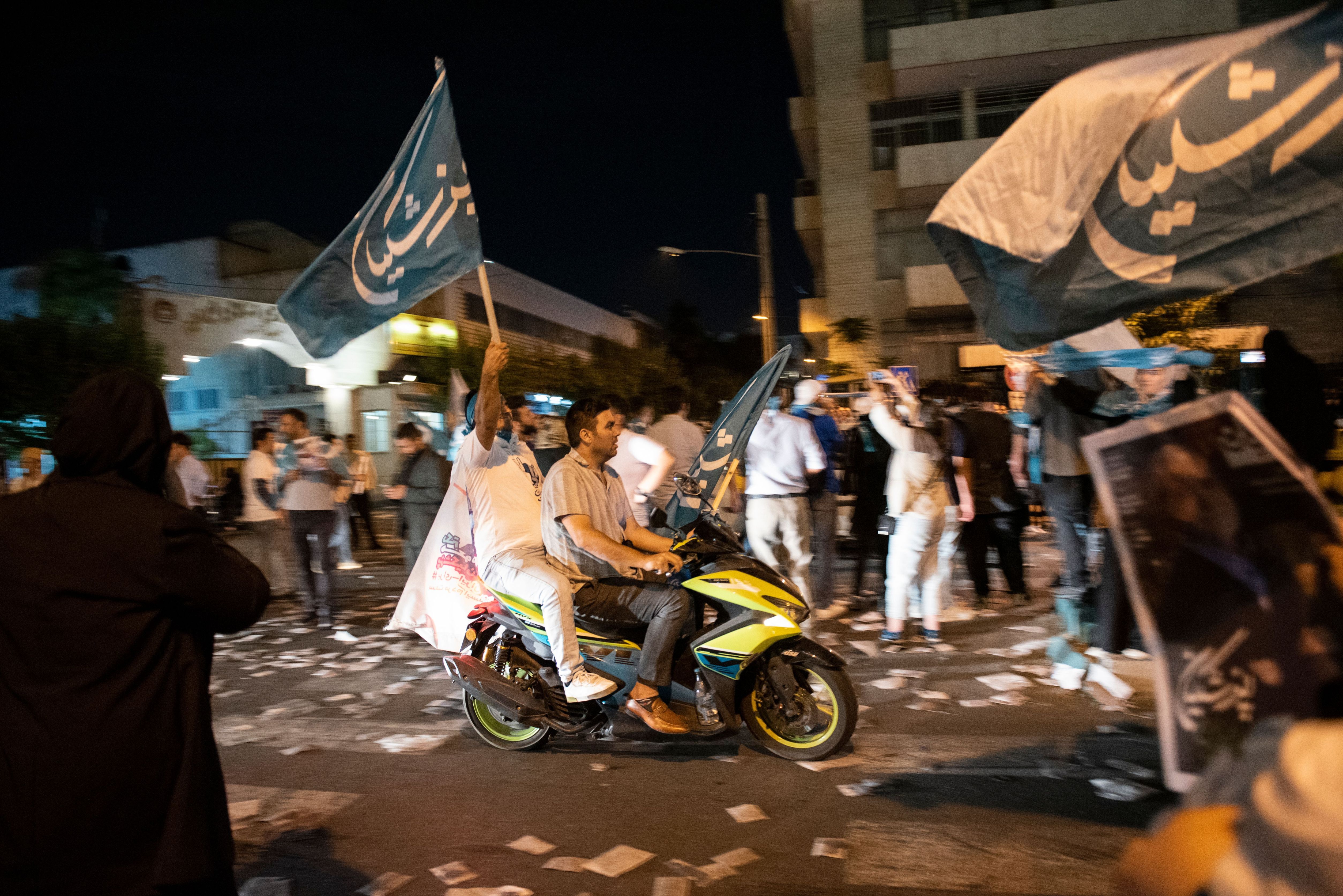 A supporter of Masoud Pezeshkian, a candidate for the June 28 presidential election, holds symbols of his election during a Streetly campaign gathering in Tehran, Iran, Wednesday, June 26, 2024. (Photo by Sobhan Farajvan/Pacific Press/Rex Features/Shutterstock)