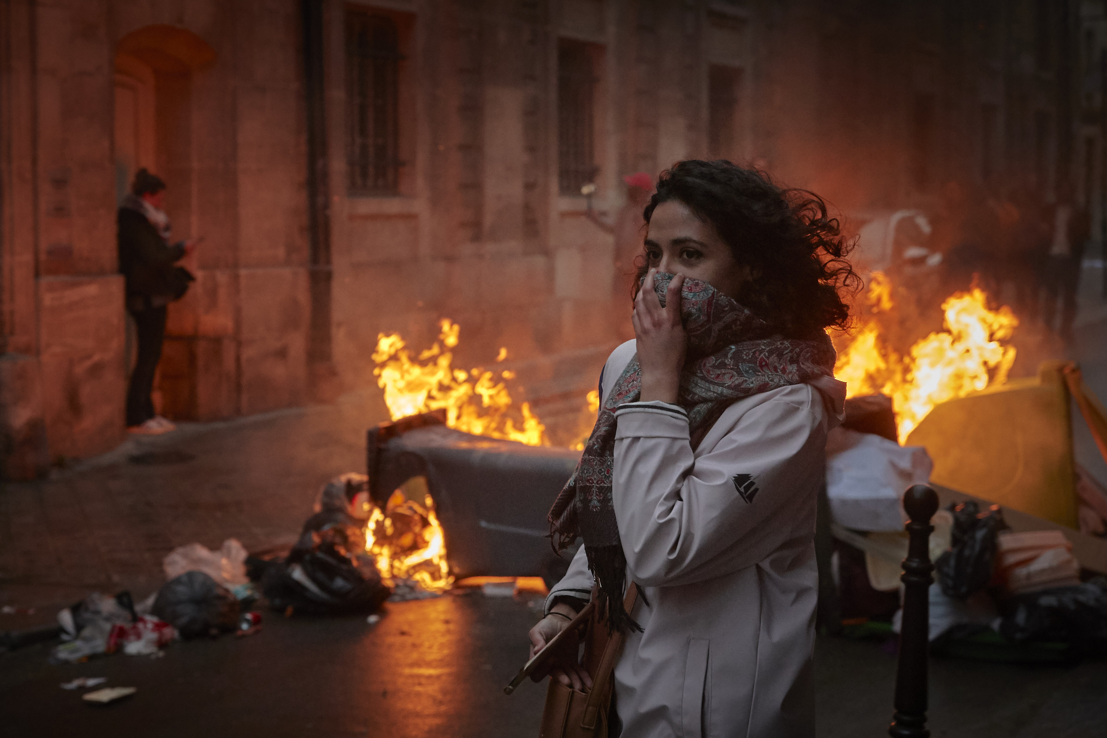 A woman runs past a burning barricade holding a scarf to her face during demonstrations in central Paris against the French Government's Pension Law ahead of a final decision on the law by French lawmakers on April 14, 2023 in Paris, France. After three months of nationwide strikes and protests against the French Government's plans to raise the minimum pension age from 62 to 64, the ruling by France's highest constitutional court means that the Government can pass the law as early as next week. (Photo by Kiran Ridley/Getty Images)
