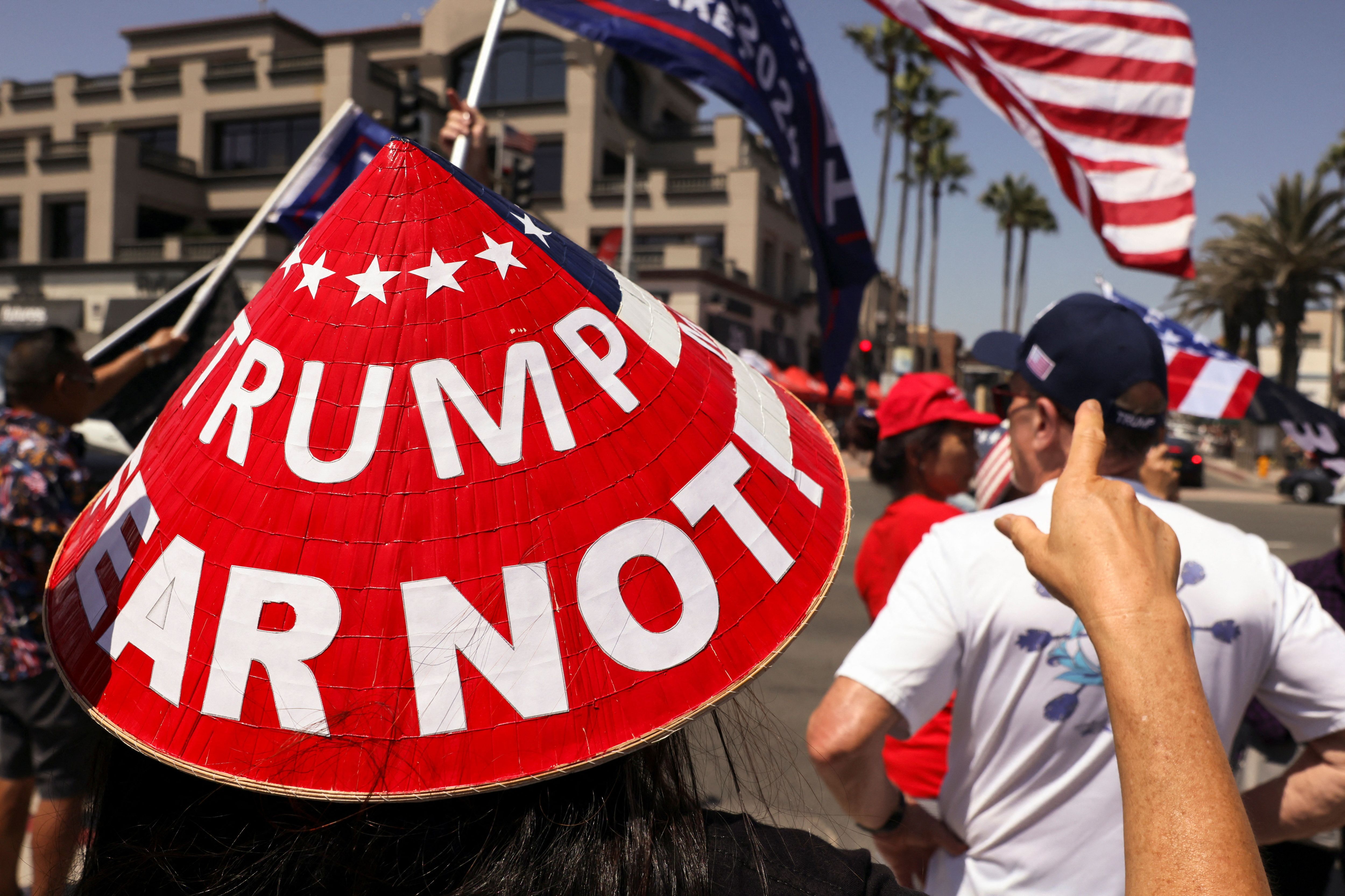 A demonstrator wears a hat reading “Trump Fear Not” as Pro-Trump supporters gather during a demonstration in support of former President Donald Trump who was shot the previous day in an assassination attempt during a rally in Pennsylvania, in Huntington Beach, California on July 14, 2024. (Photo by Etienne Laurent/Reuters)