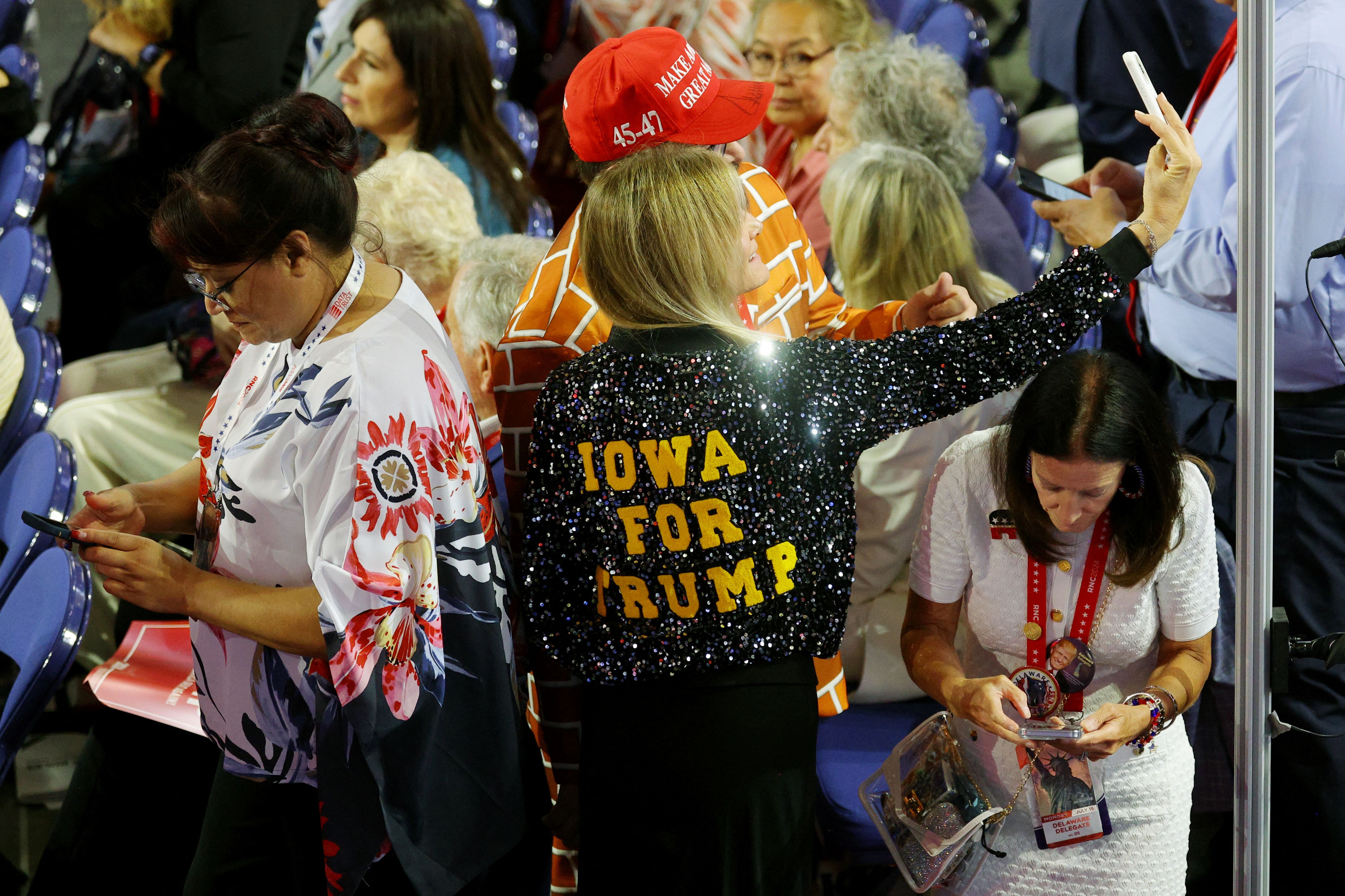 A person wearing a jacket in support Donald Trump poses on Day 1 of the RNC in Milwaukee on July 15, 2024. (Photo by Brian Snyder/Reuters)