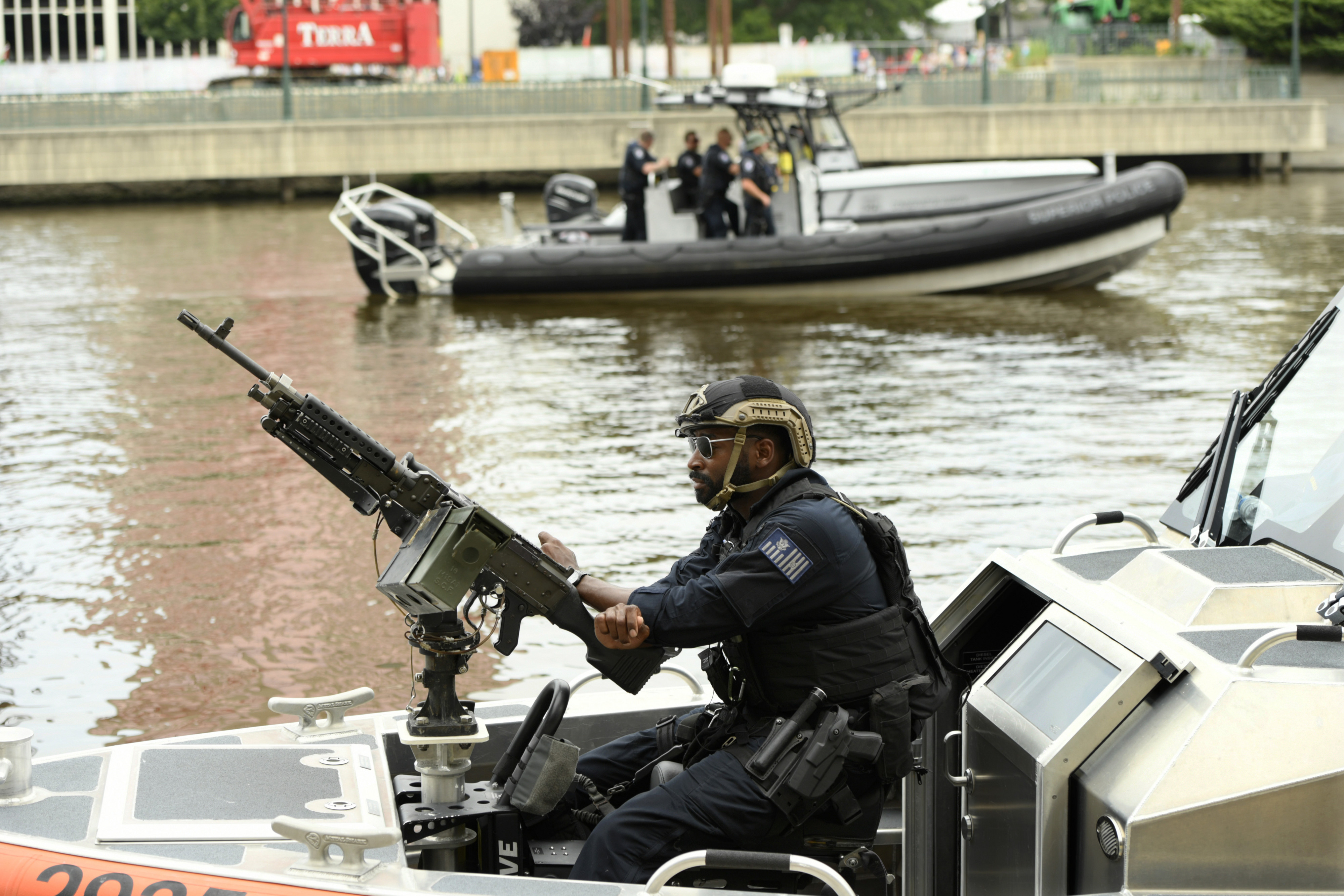 Police and the Coast Guard patrol the river in Milwaukee, Wisconsin on Monday, July 15, 2024. The city of Milwaukee is hosting the 2024 Republican Convention which will run from July 15th through July 18th. (Photo by Paul Beaty/UPI/Rex Features/Shutterstock)