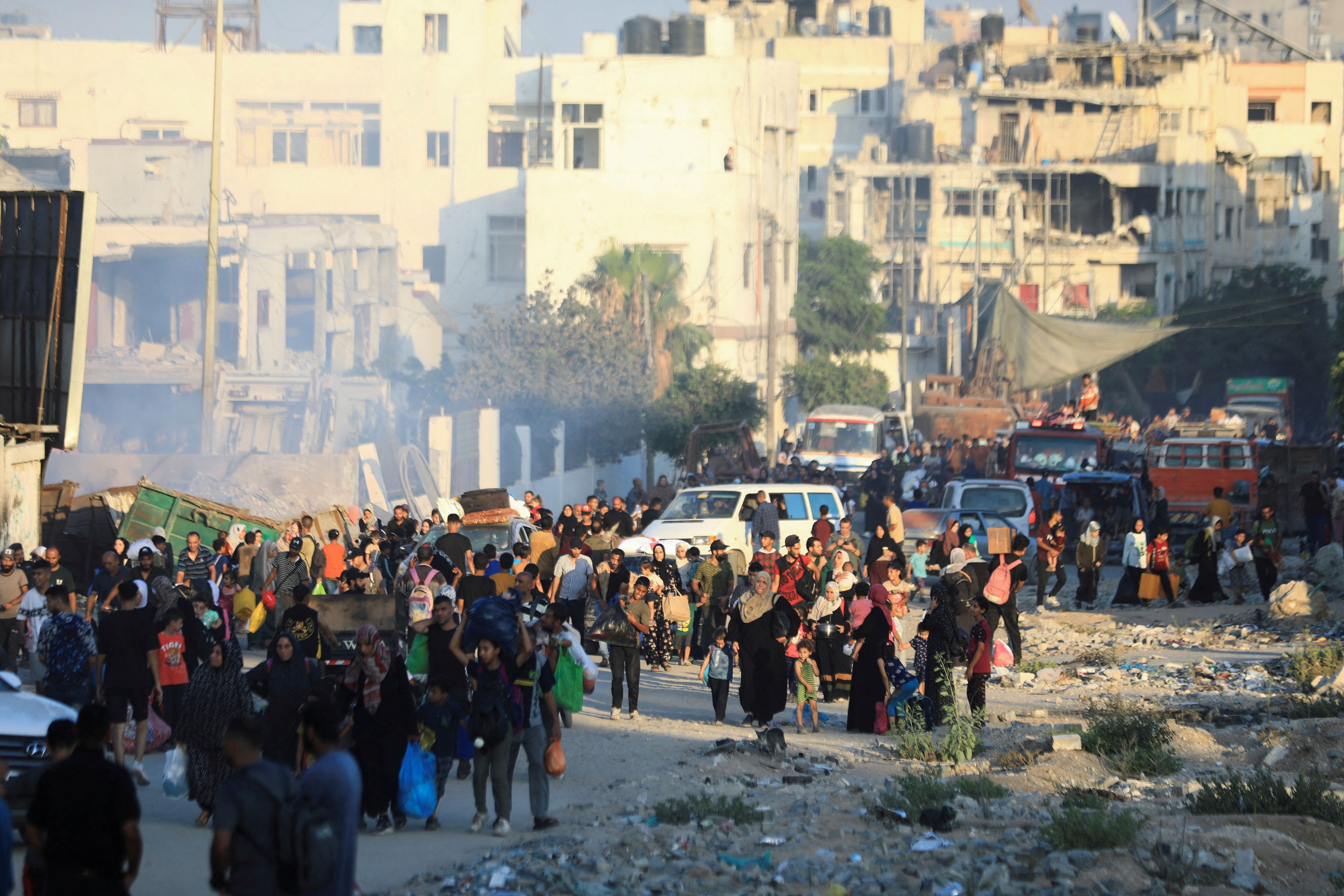 Palestinians, who fled the eastern part of Gaza City after they were ordered by Israeli army to evacuate their neighborhoods, carry their belongings, amid Israel-Hamas conflict, in Gaza City, on July 7, 2024. (Photo by Dawoud Abu Alkas/Reuters)