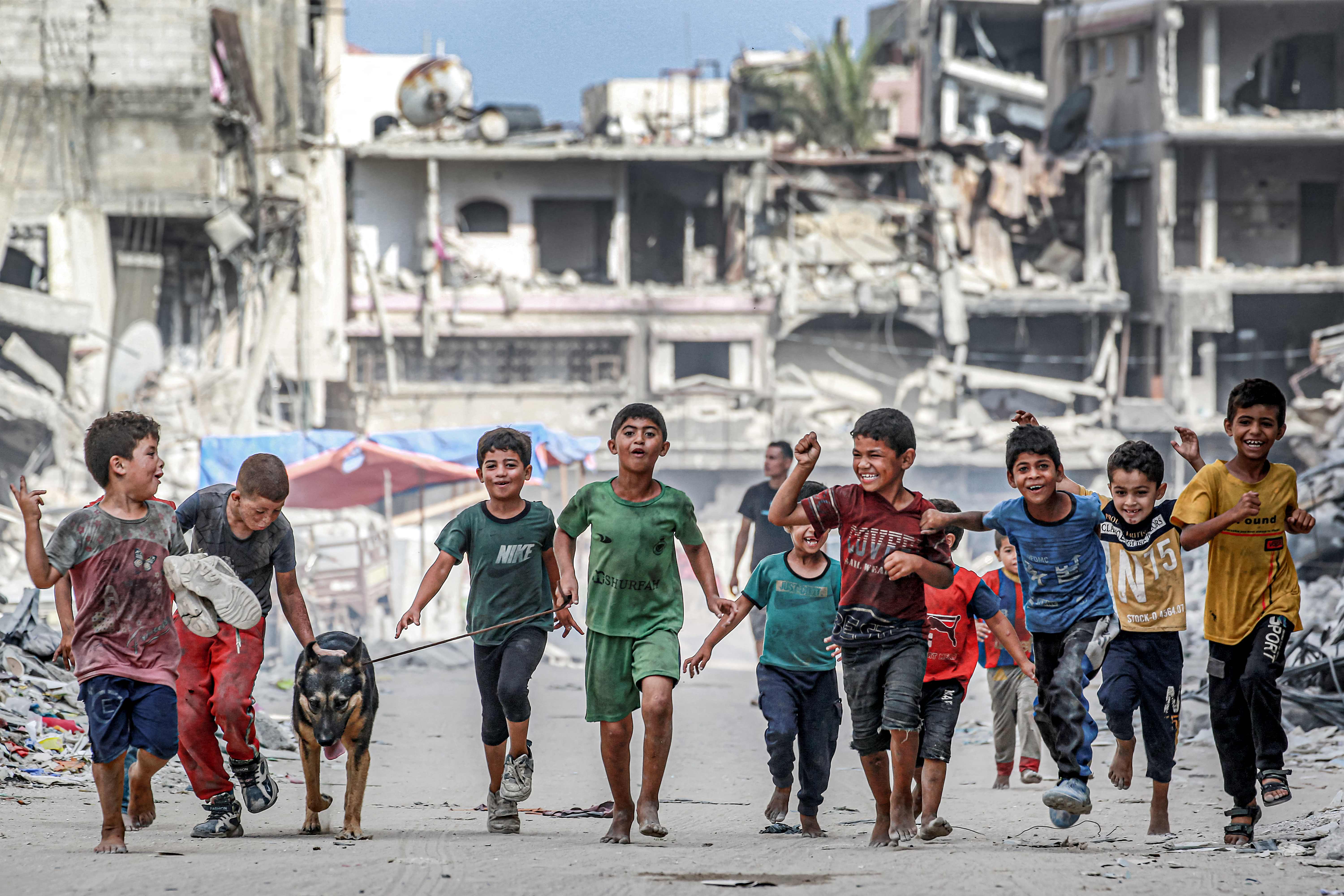 Children walk with a dog past destroyed buildings along a street in Khan Yunis in the southern Gaza Strip on July 8, 2024 amid the ongoing conflict in the Palestinian territory between Israel and Hamas. (Photo by Bashar Taleb/AFP Photo)