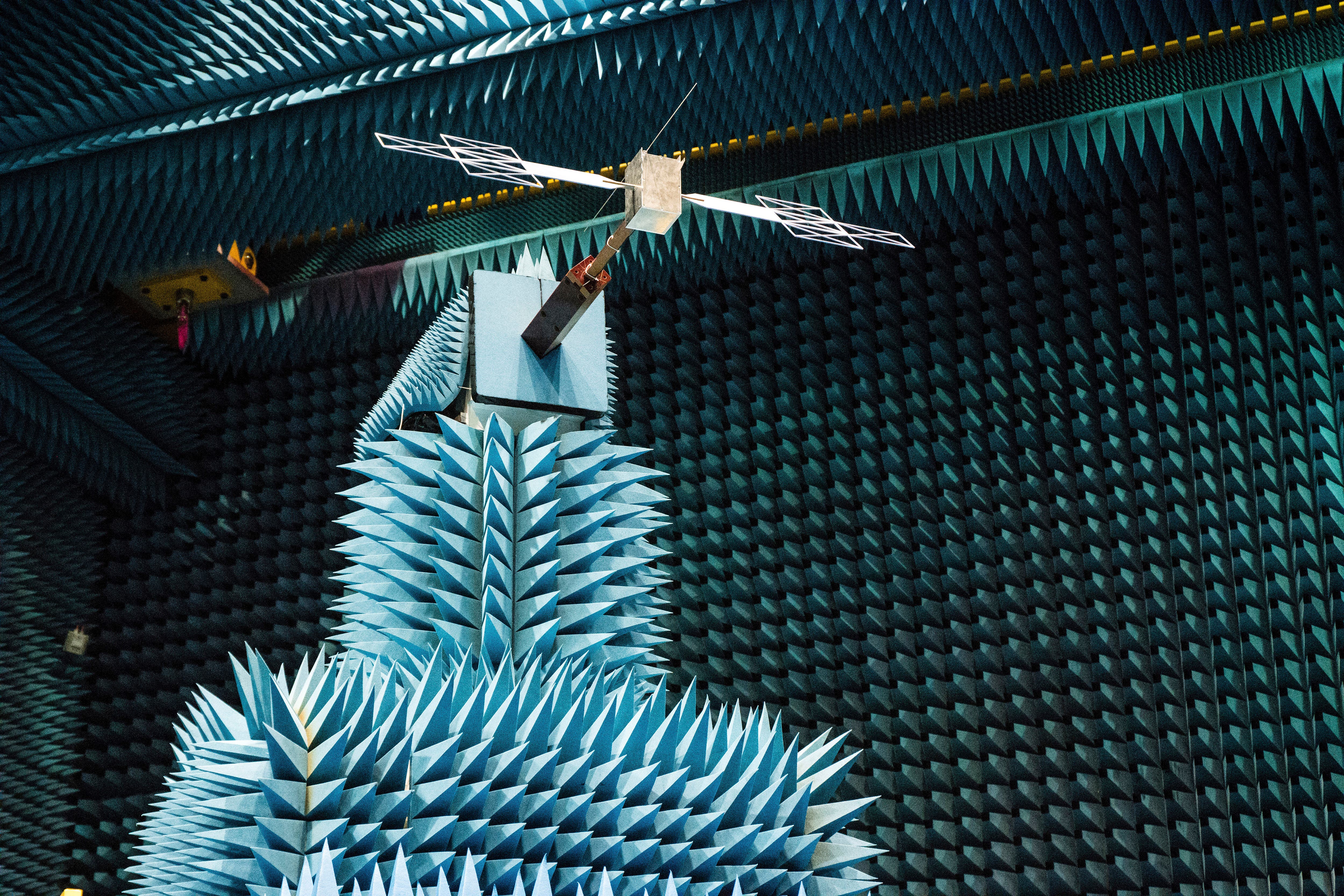 In this undated photo provided by the European Space Agency, a 1:18 scale model of the Juice mission's RIME antenna – Radar for Icy Moons Exploration, mounted on top of a simplified spacecraft model during tests in the Hertz facility at the European Space Research and Technology Centre (ESTEC) in Noordwijk, The Netherlands. The European Space Agency said Friday, April 28, 2023, that the 52-foot radar antenna on its Juice spacecraft unfolded only one-third of the way following liftoff. (Photo by European Space Agency via AP Photo)