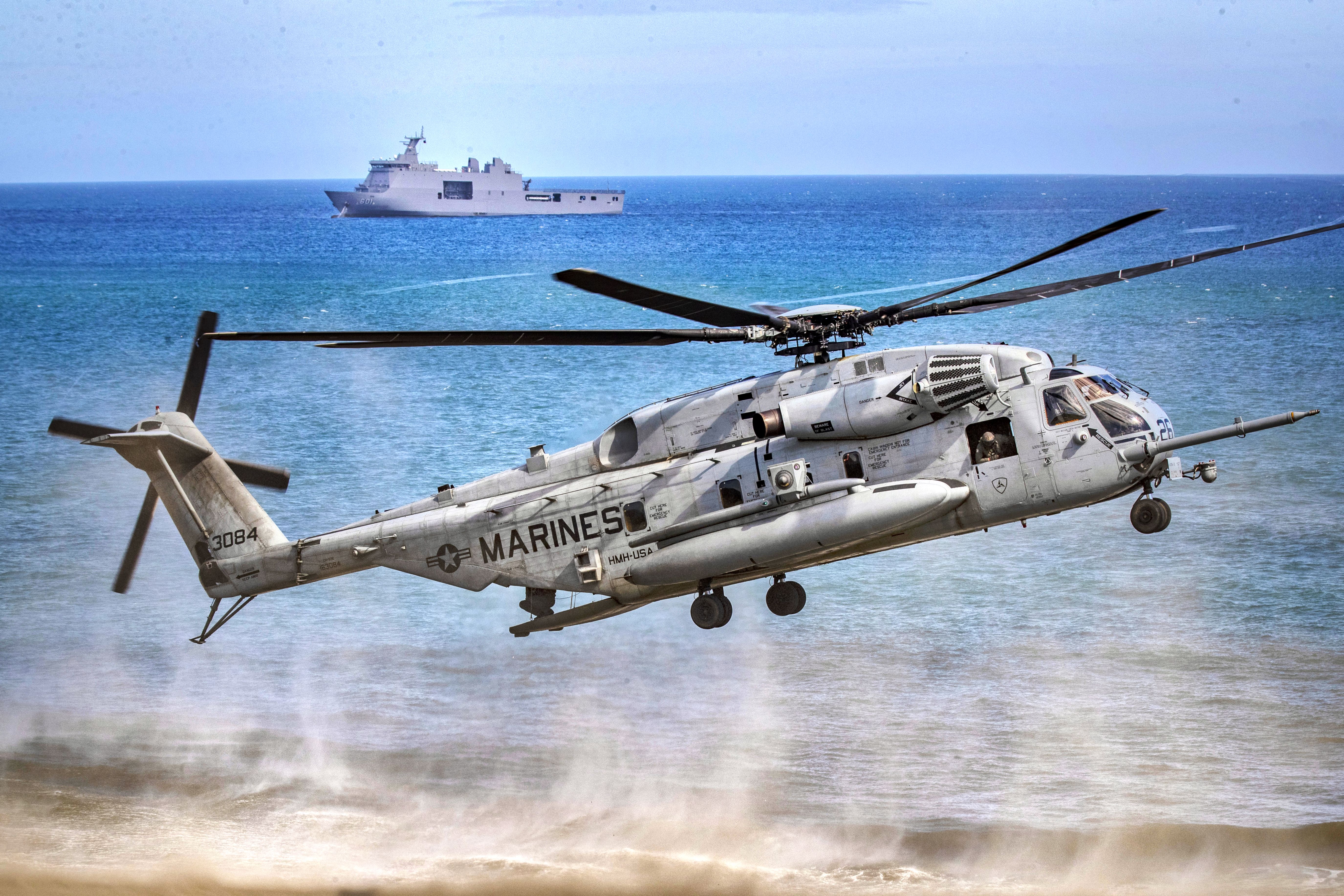 A US Marine CH53 helicopter takes off as US and Philippine marines take part in a joint amphibious assault exercise as part of the annual 'Balikatan' (shoulder-to-shoulder) US-Philippines war exercises, off the waters of South China Sea on March 31, 2022 in Claveria, Cagayan province, Philippines. This year’s exercise, which the two sides are billing as the largest ever with nearly 9,000 troops taking part, also comes at a time of increasing geopolitical uncertainty amid the Russia-Ukraine war and China’s continuing assertiveness in disputed territories of the South China Sea, including in areas claimed by the Philippines. (Photo by Ezra Acayan/Getty Images)