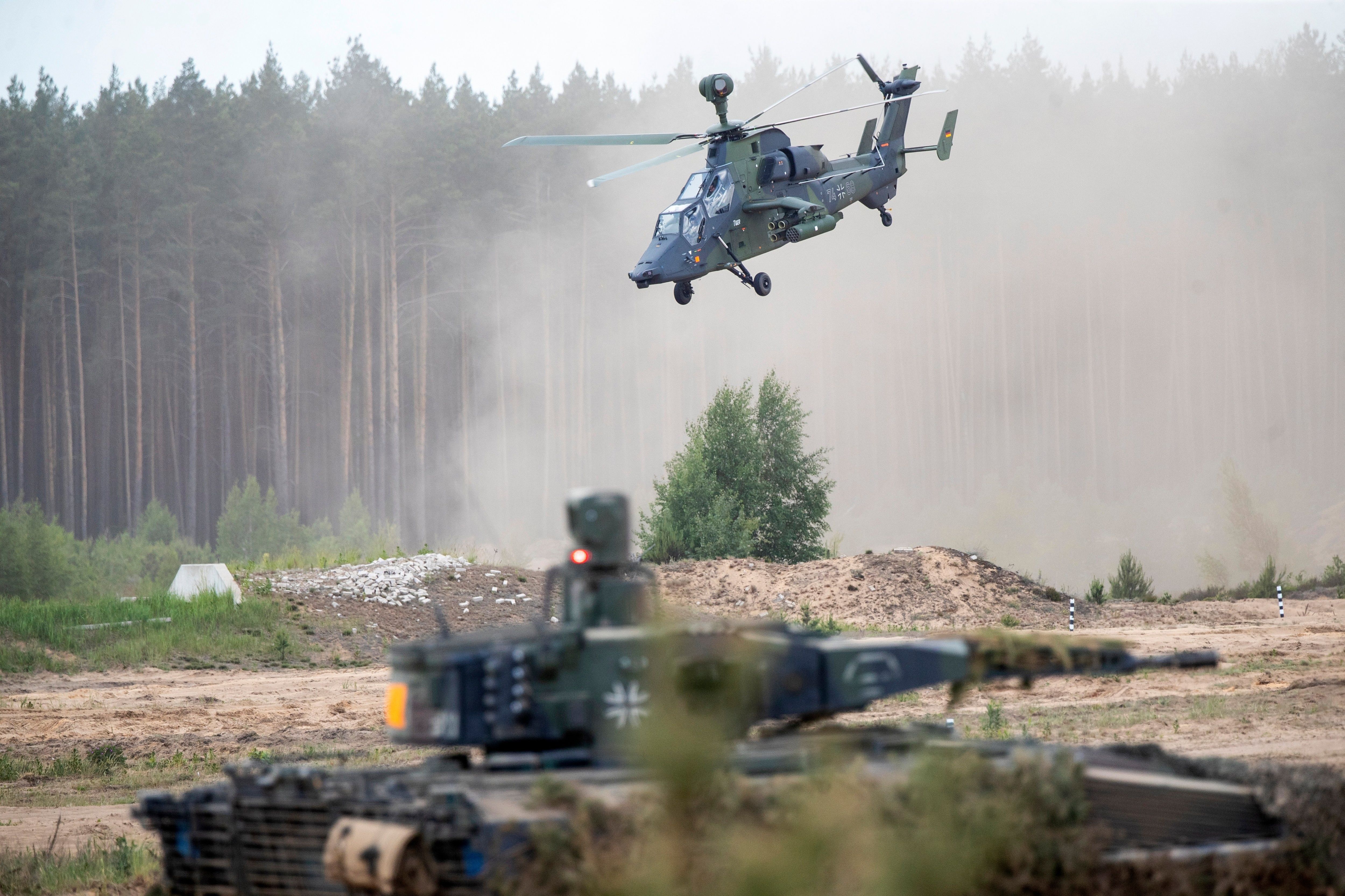 Eurocopter Tiger of the German Army takes part in the Lithuanian-German division-level international military exercise “Grand Quadriga 2024” at a training range in Pabrade, north of the capital Vilnius, Lithuania on Wednesday, May 29, 2024. “Grand Quadriga 2024”, a wide-scale exercise of the German Bundeswehr that rehearses moving two divisions from the central part of Europe to eastern. Over 3 thousand German troops and military equipment has been moved to Lithuania.(Photo by Mindaugas Kulbis/AP Photo)