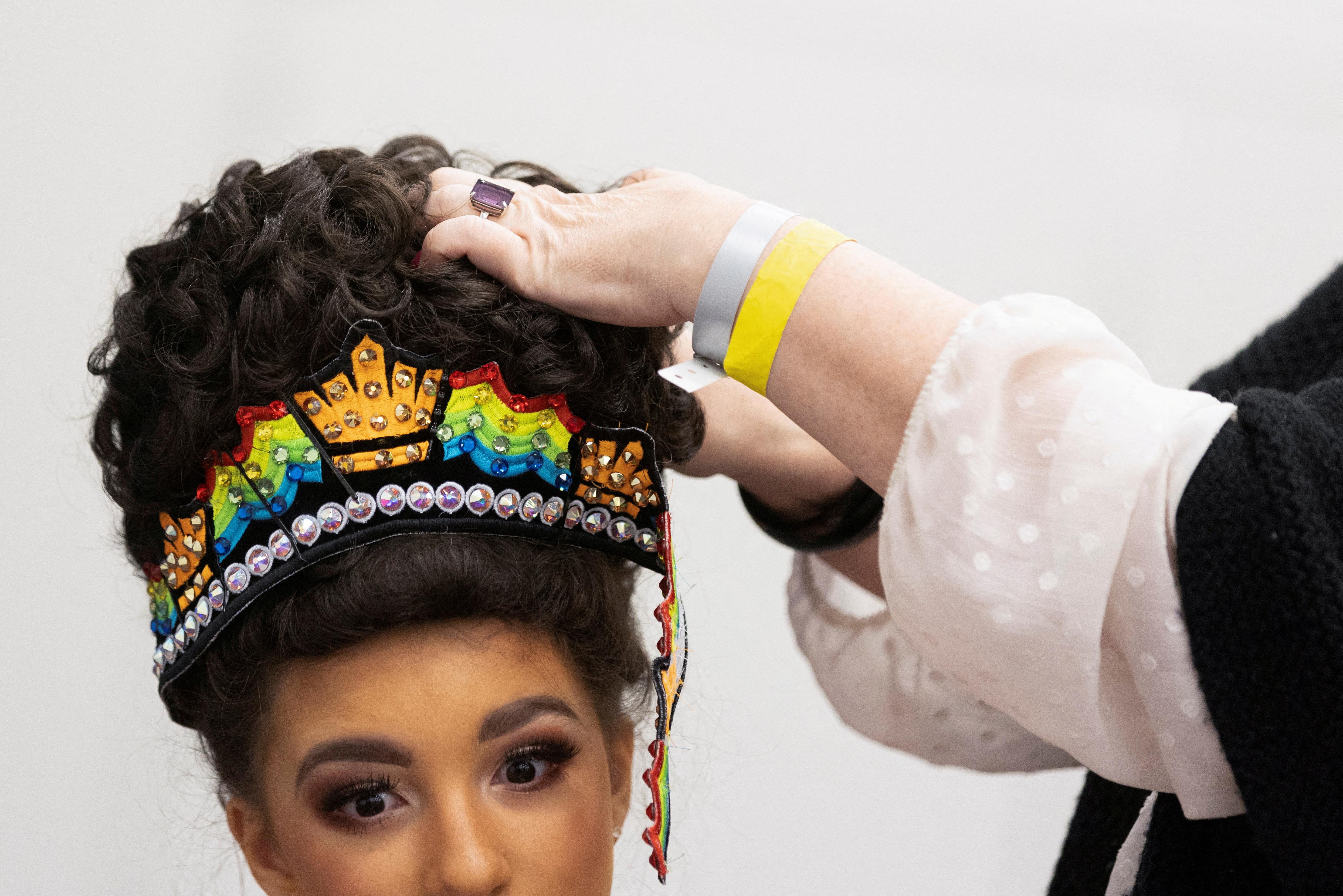 Eliza Jose of Doherty Petri School of Irish Dancing in New York has her hair fixed prior to her performance at the World Irish Dancing Championship in Montreal, Quebec, Canada on April 2, 2023. (Photo by Christinne Muschi/Reuters)