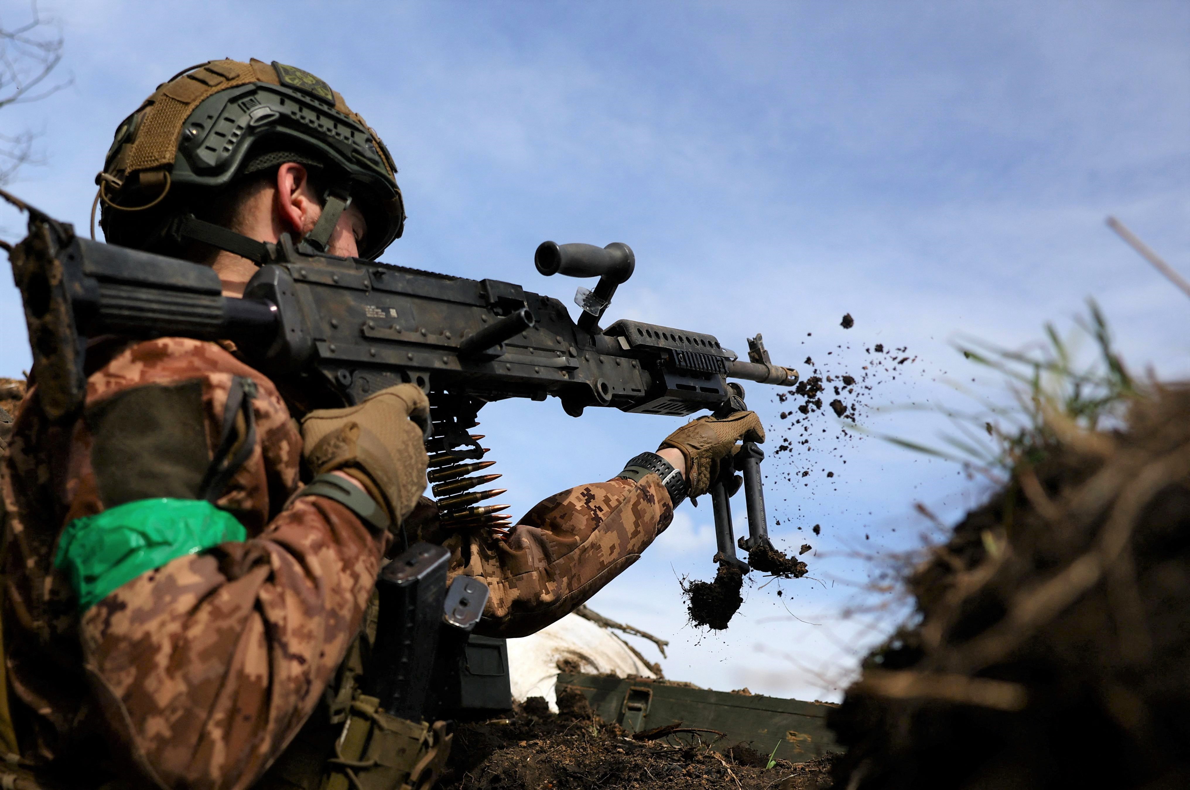 Ukrainian service member, Naza, 21, commander from 28th mechanised brigade repositions his machine gun during a fire exchange at the frontline, amid Russia's attack on Ukraine in the region of Bakhmut, Ukraine on April 5, 2023. (Photo by Kai Pfaffenbach/Reuters)