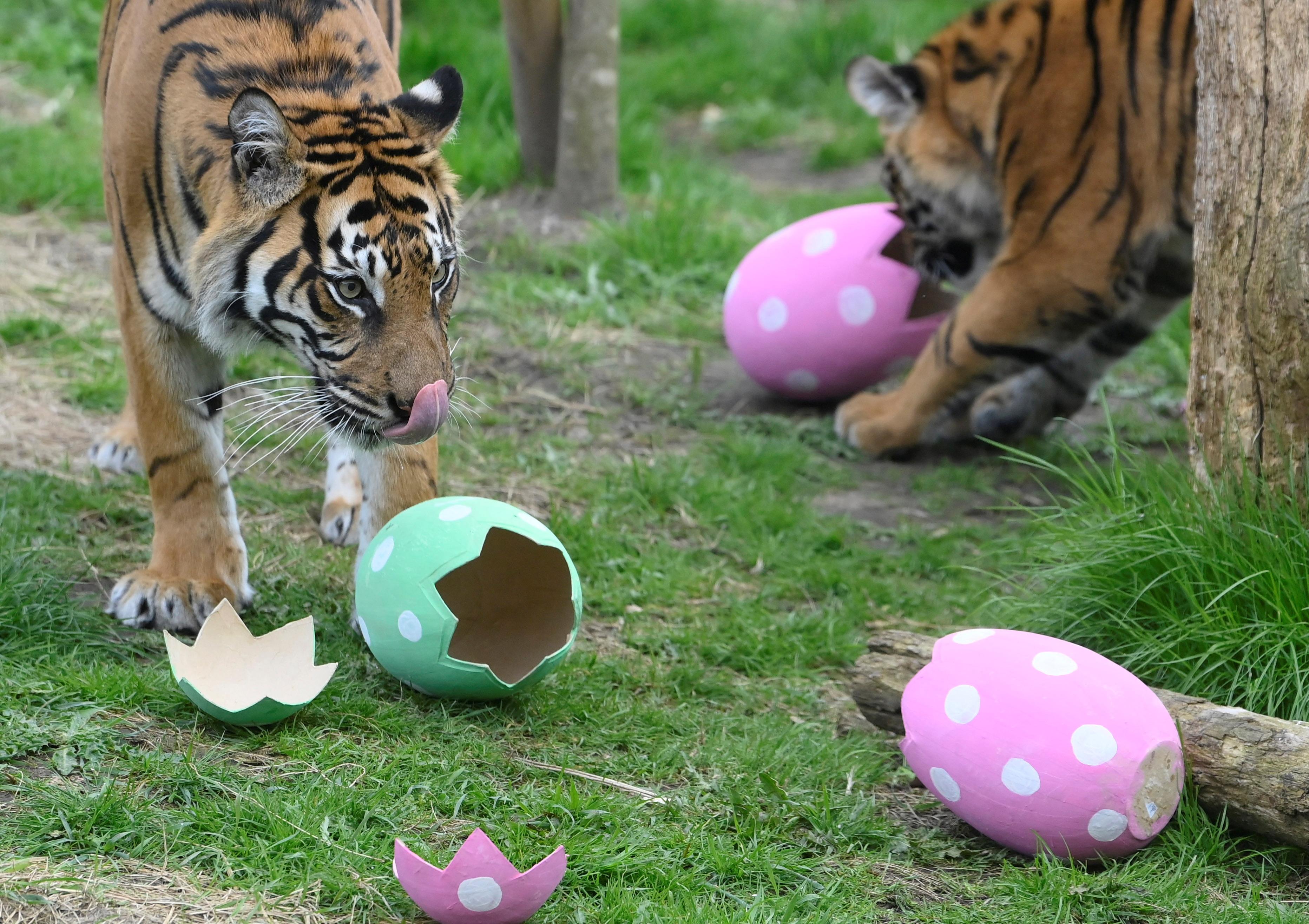 Critically endangered Sumatran tigers sample cinnamon scented egg shapes, which encourages natural foraging and hunting behaviours, according to London Zoo, during a seasonal publicity event at ZSL London Zoo in London Britain on April 5, 2023. (Photo by Toby Melville/Reuters)