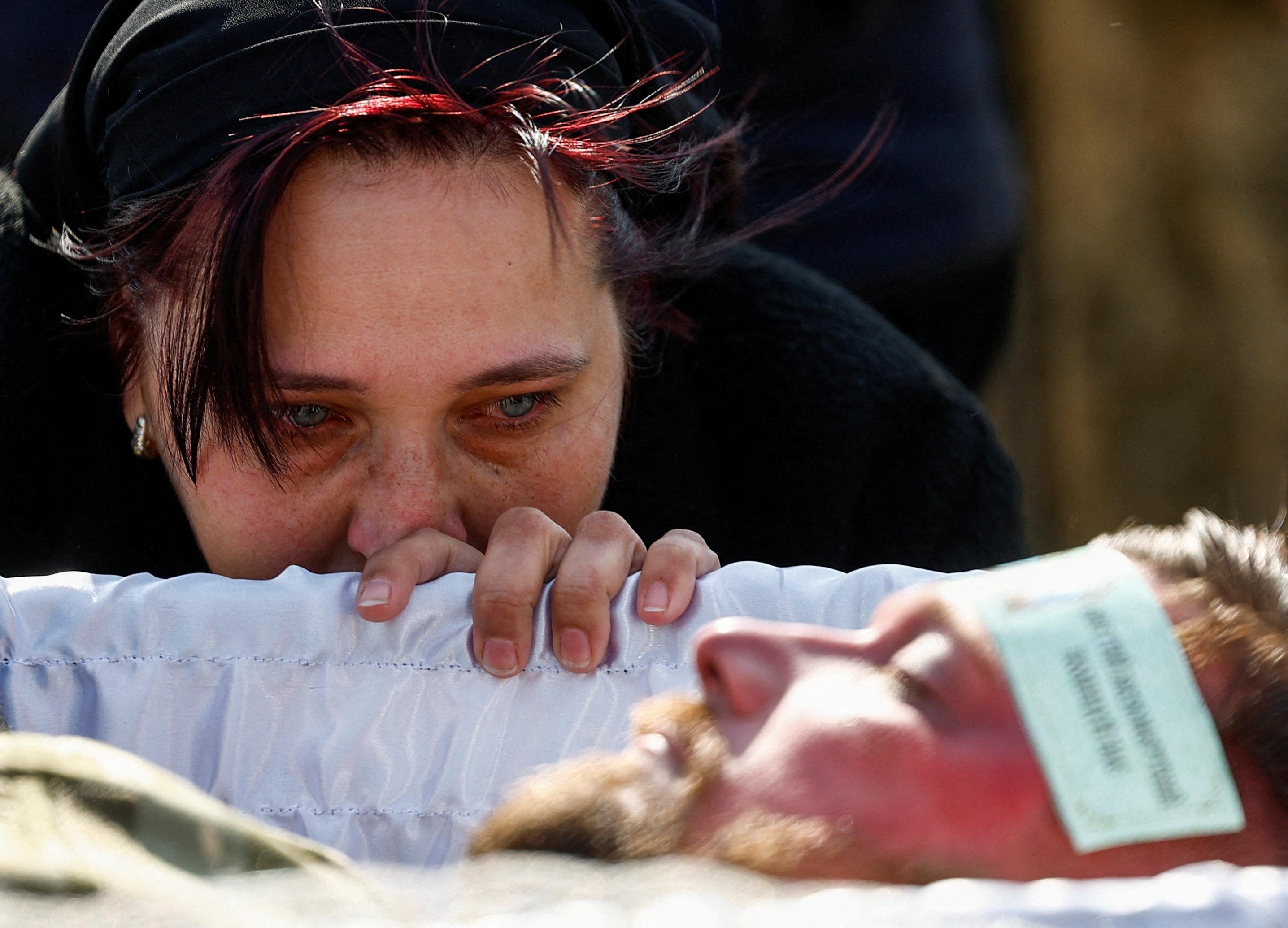 Svitlana looks at the body of her husband Kostiantyn Starovytskyi, a Ukrainian conductor, musician and serviceman, who was recently killed in a fight against Russian troops in Donetsk region, amid Russia's attack on Ukraine, during a funeral ceremony in the town of Brovary, outside of Kyiv, Ukraine on April 11, 2023. (Photo by Valentyn Ogirenko/Reuters)
