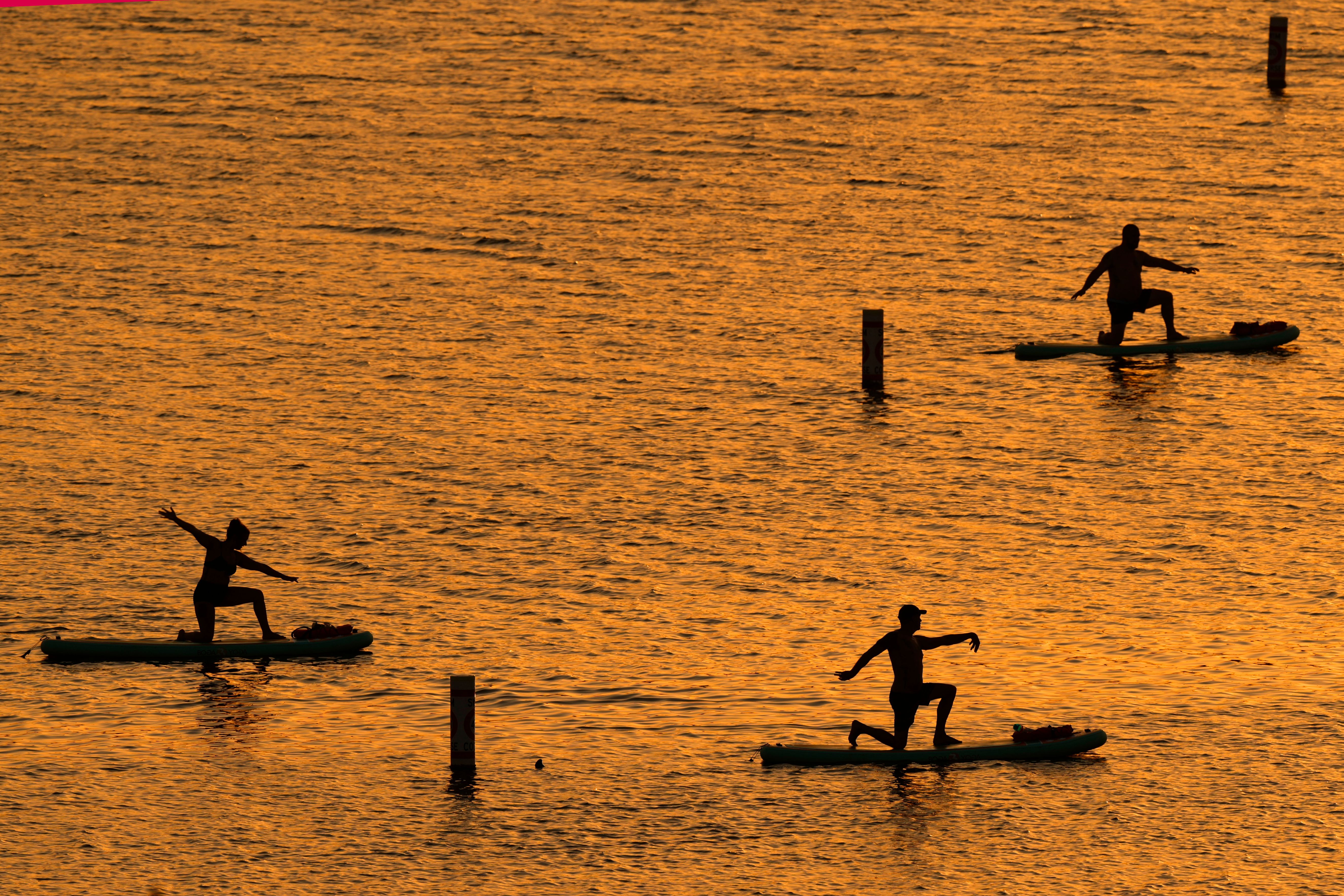 People do yoga poses on paddleboards at sunset as the heat index tops 100 degrees at Olathe Lake, Monday, July 15, 2024, in Olathe, Kan. (Photo by Charlie Riedel/AP Photo)