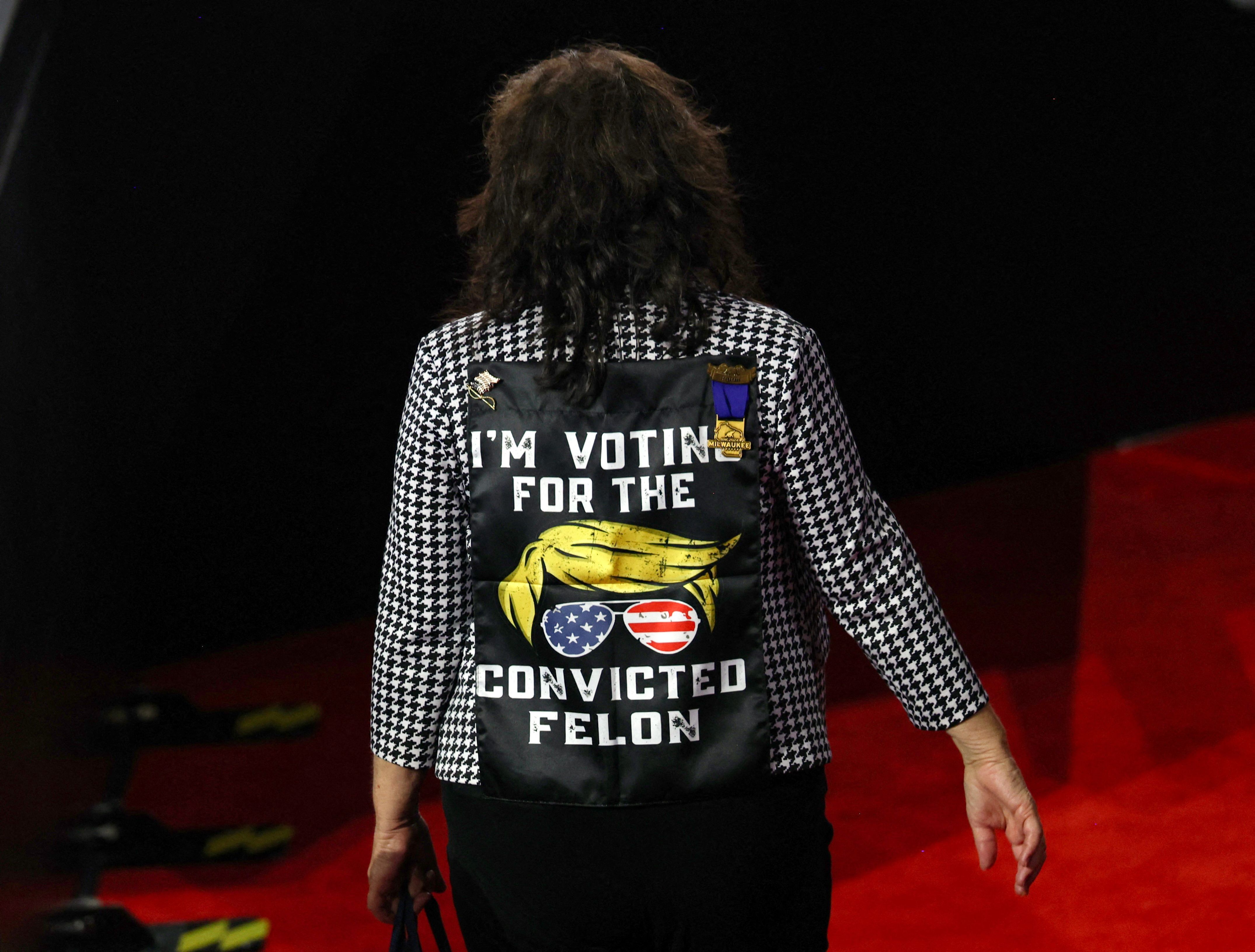 A person wearing a coat supporting former President Donald Trump walks ahead of Day 2 of the RNC, at the Fiserv Forum in Milwaukee, Wisconsin on July 16, 2024. (Photo by Mike Segar/Reuters)