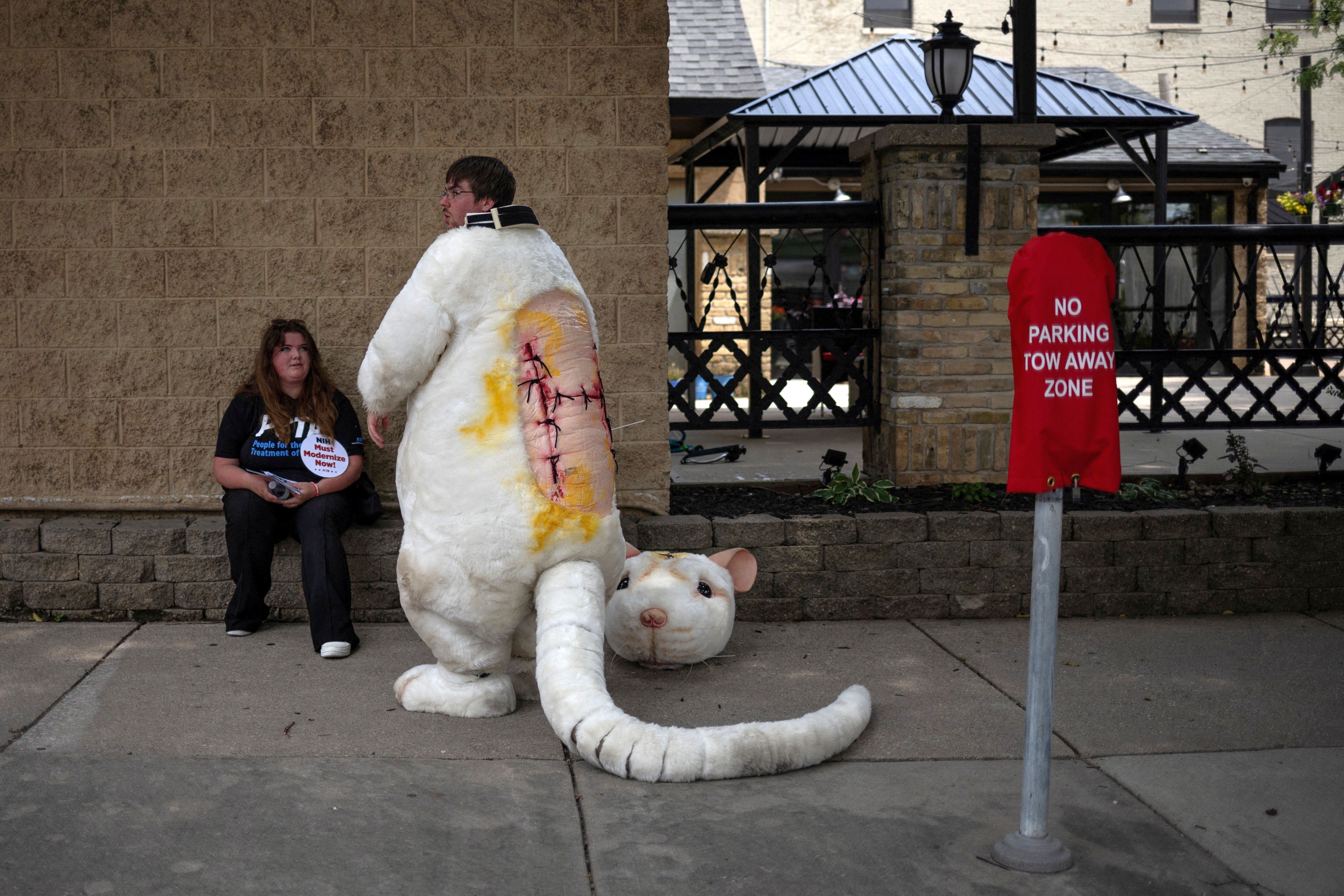 Nathan Edwards, an activist with PETA, rests after taking part in a demonstration on the sidelines of Republican National Convention in Milwaukee, Wisconsin, U.S., July 15, 2024. (Photo by Adrees Latif/Reuters)
