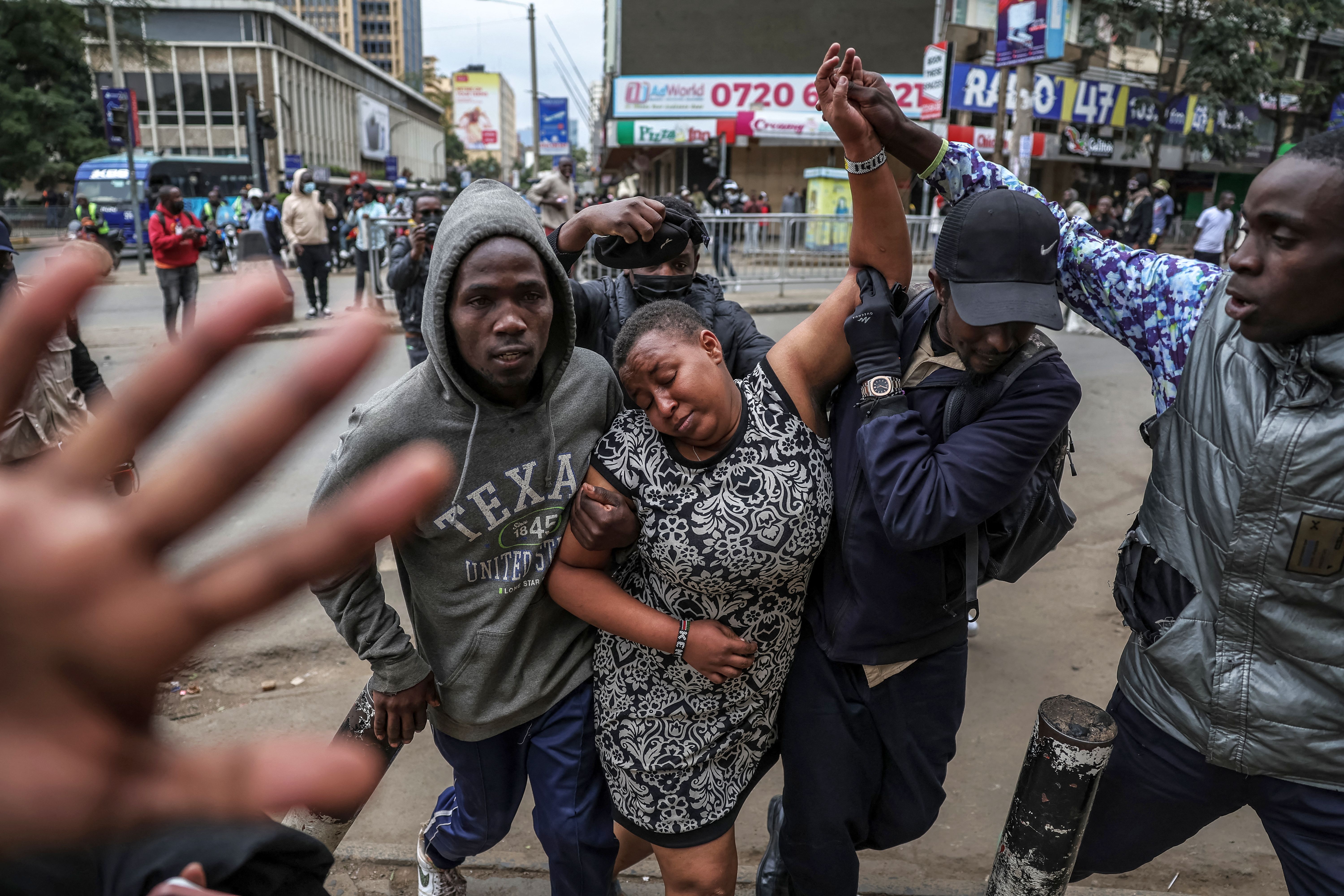 A woman (C) suffering from tear gas inhalation is helped away by during renewed demonstrations in Nairobi on July 16, 2024. Police were out in force in the centre of Kenya's capital on Tuesday after calls for more demonstrations against the embattled government of President William Ruto. Activists led by young Gen-Z Kenyans launched peaceful rallies a month ago against deeply unpopular tax hikes but they descended into deadly violence last month, prompting Ruto to drop the planned increases. (Photo by Tony Karumba/AFP Photo)