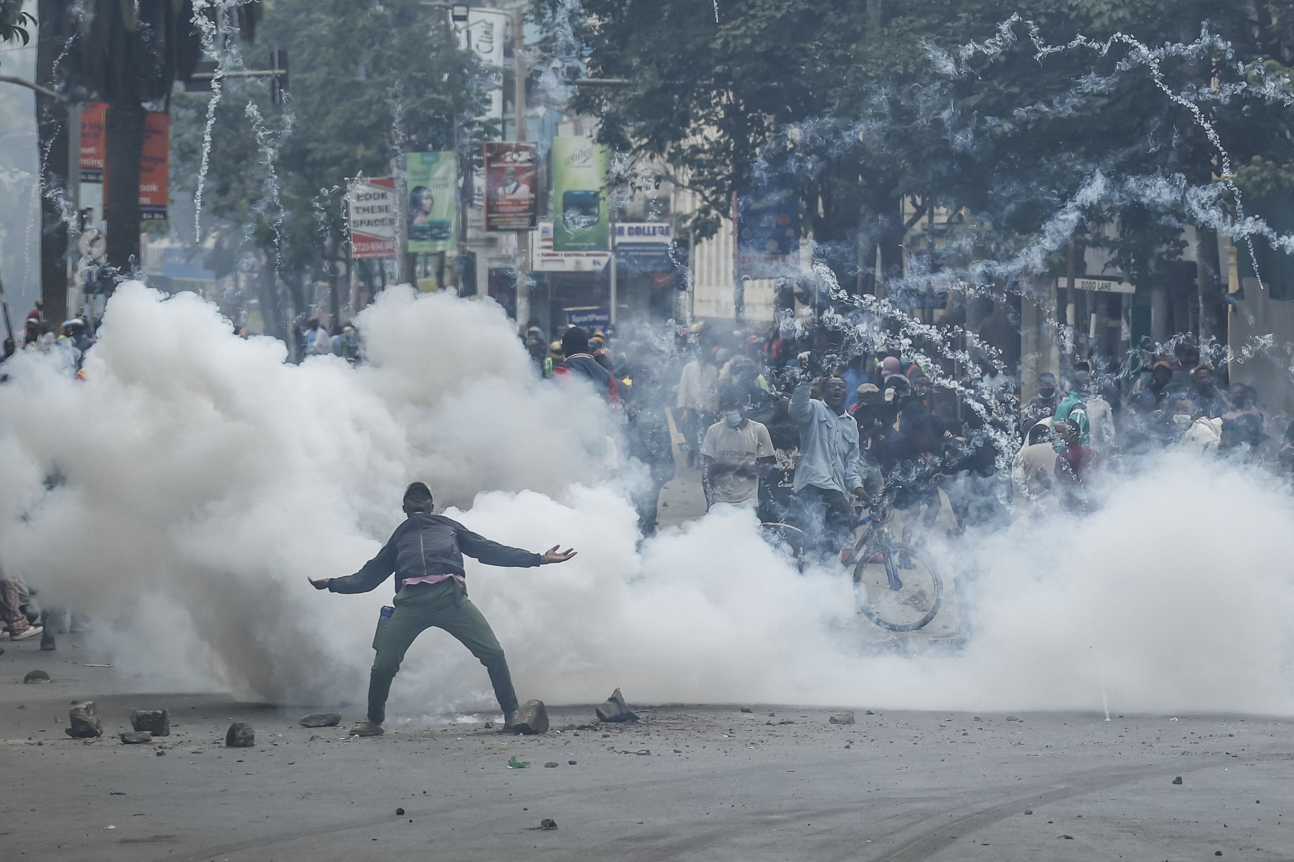 A teargas canister detonates as a protester gestures at Kenyan anti-riot police officers during anti-government protests in Nairobi on July 16, 2024. Police were out in force in the centre of Kenya's capital on Tuesday after calls for more demonstrations against the embattled government of President William Ruto. Activists led by young Gen-Z Kenyans launched peaceful rallies a month ago against deeply unpopular tax hikes but they descended into deadly violence last month, prompting Ruto to drop the planned increases. (Photo by Simon Maina/AFP Photo)