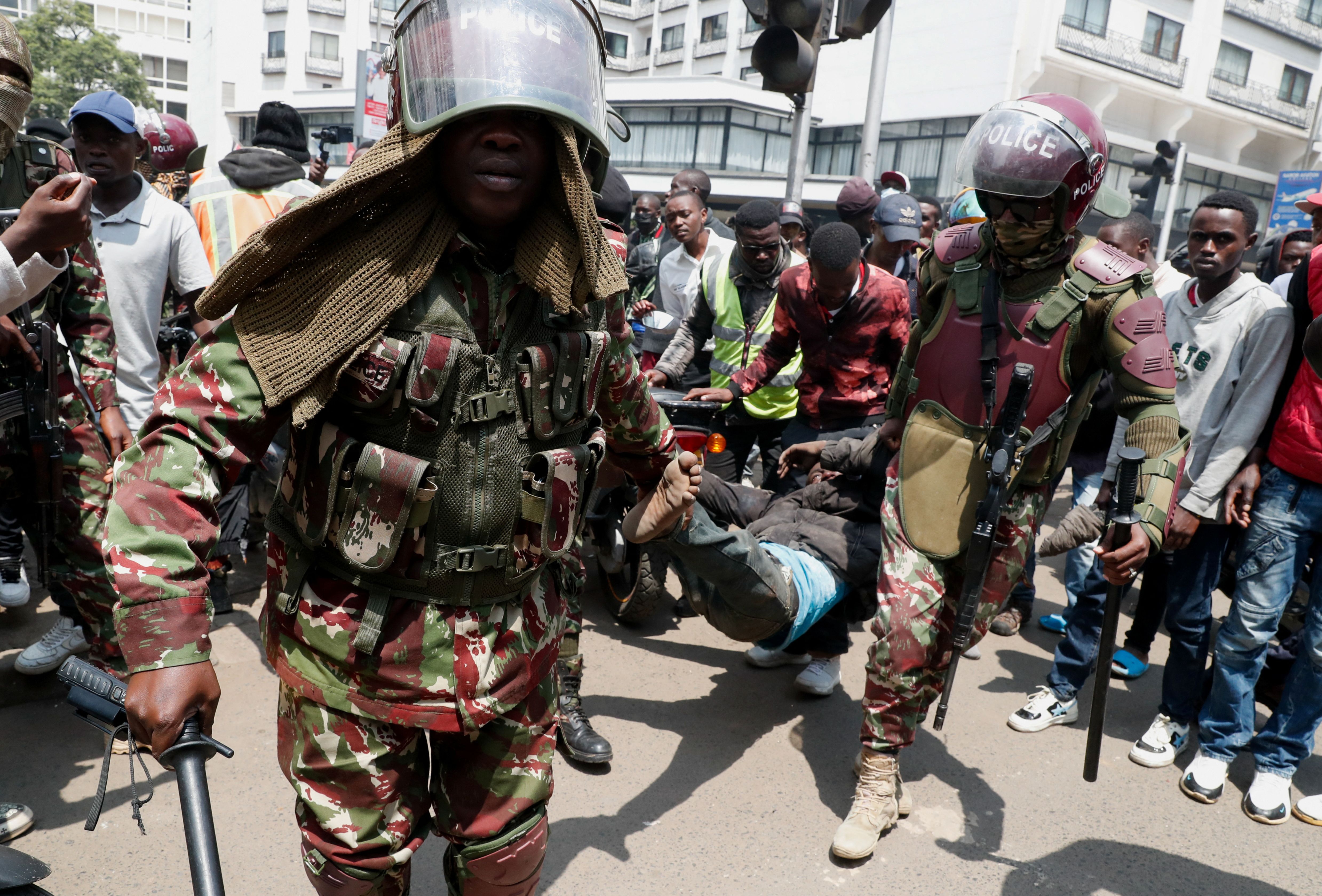 Riot police officers detain a pro-government protester, as they counter an anti-government demonstration following nationwide deadly riots over tax hikes, in Nairobi, Kenya, on July 23, 2024. (Photo by Thomas Mukoya/Reuters)
