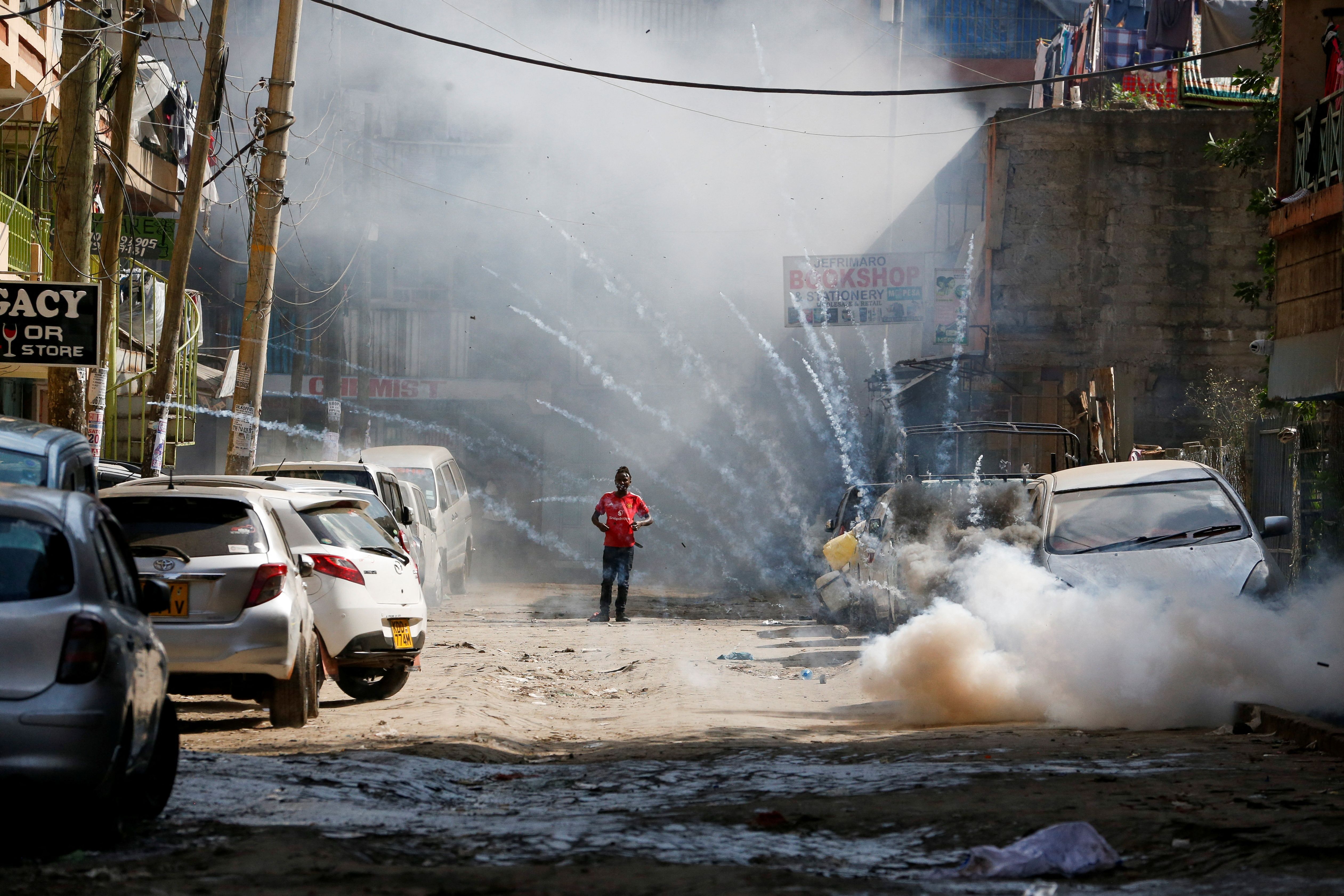 A man stands as riot police use teargas to disperse protesters during an anti-government demonstration following nationwide deadly riots over tax hikes, within Pipeline estate near the Jomo Kenyatta International airport (JKIA) in Nairobi, Kenya on July 23, 2024. (Photo by Thomas Mukoya/Reuters)