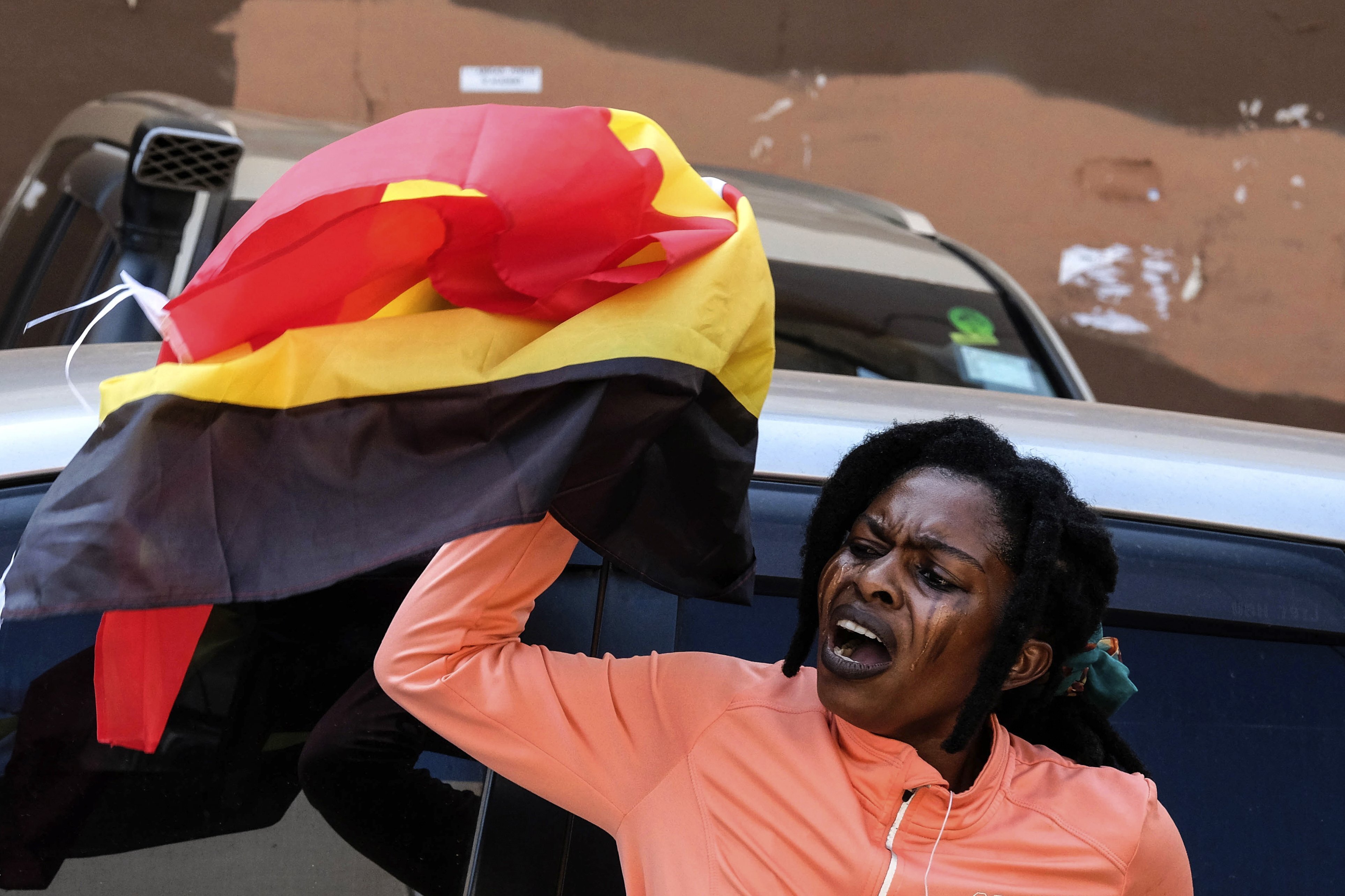 A protester holding a her country national flag during the anticorruption protest in Kampala, Uganda, Tuesday, July 23, 2024. Ugandan security forces on Tuesday arrested dozens of people who tried to walk to the parliament building to demonstrate against high-level corruption in protests that authorities say are unlawful. (Photo by Hajarah Nalwadda/AP Photo)