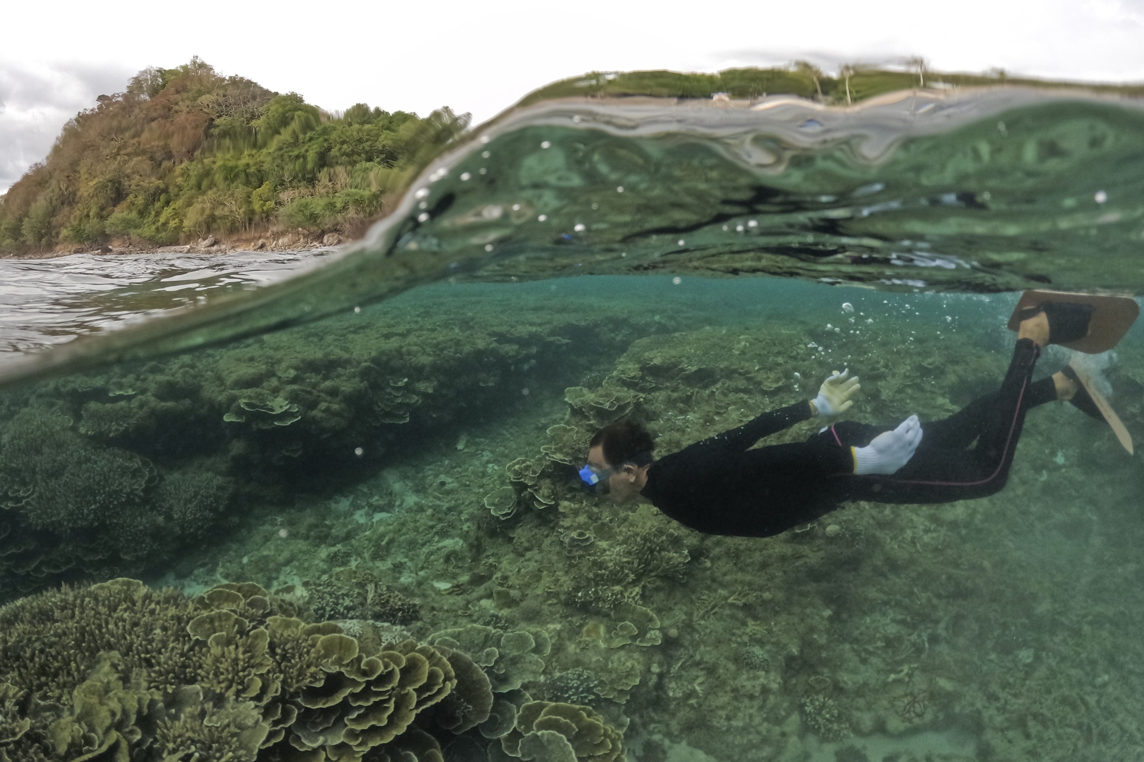 A man swims beside corals off of Verde Island, Batangas province, Philippines on Wednesday, January 24, 2024. The Philippines is seeing one of the world's biggest buildouts of natural gas infrastructure. But the buildout raises serious questions about the health of nearby coral reefs and fishing communities. (Photo by Aaron Favila/AP Photo)
