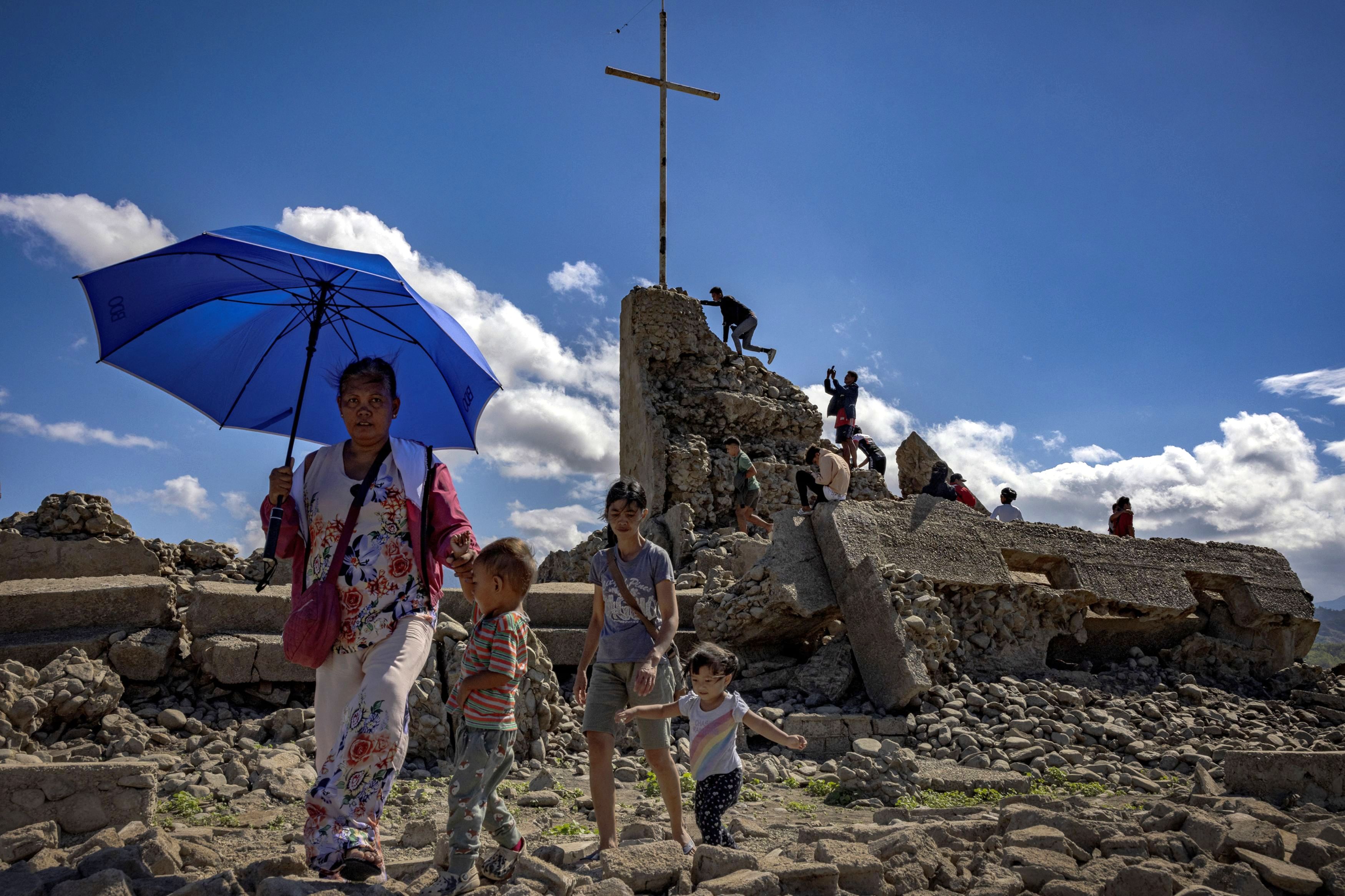 People visit the remnants of the old sunken town of Pantabangan on April 28, 2024 in Nueva Ecija province, Philippines. Due to a severe drought in the Philippines, a centuries-old settlement submerged since the 1970s has reemerged, attracting tourists despite the extreme heat. This event marks the sixth appearance of the nearly 300-year-old ruins of old Pantabangan town, including parts of a church and tombstones, since the construction of a dam for irrigation and hydro-power. The reservoir's water level has dropped nearly 50 meters below normal as the country faces extreme heat exacerbated by El Niño conditions, leading to official drought declarations in about half of the country's provinces. (Photo by Ezra Acayan/Getty Images)