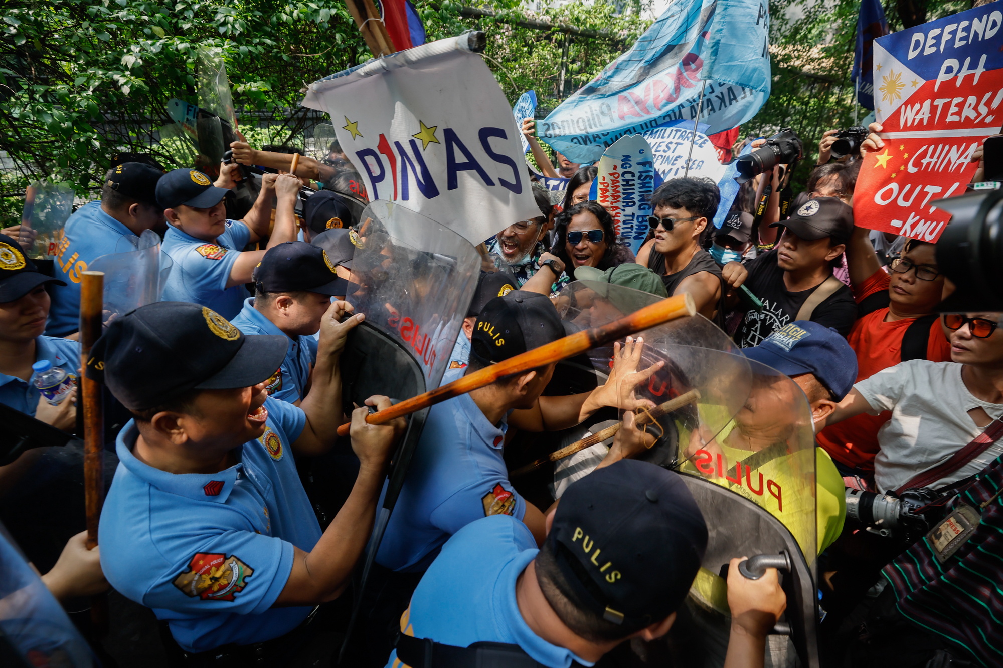 Police block protesters holding a rally to criticize agressive sea maneuvers of Chinese defense units against Philippine vessels in the South China Sea, outside China's consular office in Makati City, Metro Manila, Philippines, 14 June 2024. The protesters opposed plans by China to implement trespassing rules in disputed areas of the South China Sea, a move that could further endanger Philippine defense contingents and Filipino fishing workers. (Photo by Rolex Dela Pena/EPA)