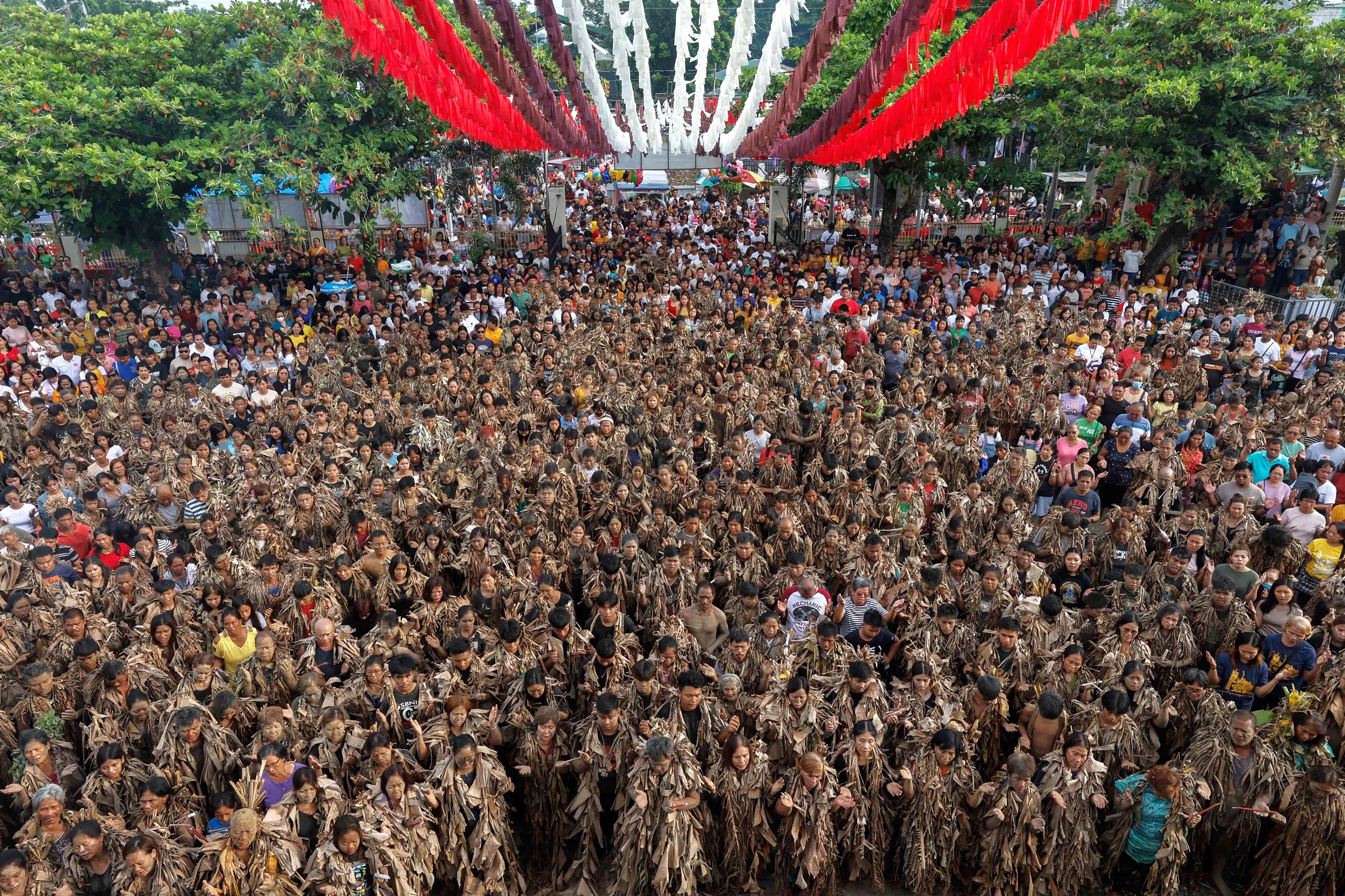 Catholic devotees covered in mud and dried leaves gather at church grounds for a holy mass during the Taong Putik Festival (Mud People) in Bibiclat village, Aliaga town in Nueva Ecija province, Philippines, 24 June 2024. The early morning ritual of the Mud People is followed by a holy mass to honor the feast day of Saint John the Baptist, as devotees give thanks and pray for more blessings in life. (Photo by Rolex Dela Pena/EPA/EFE)