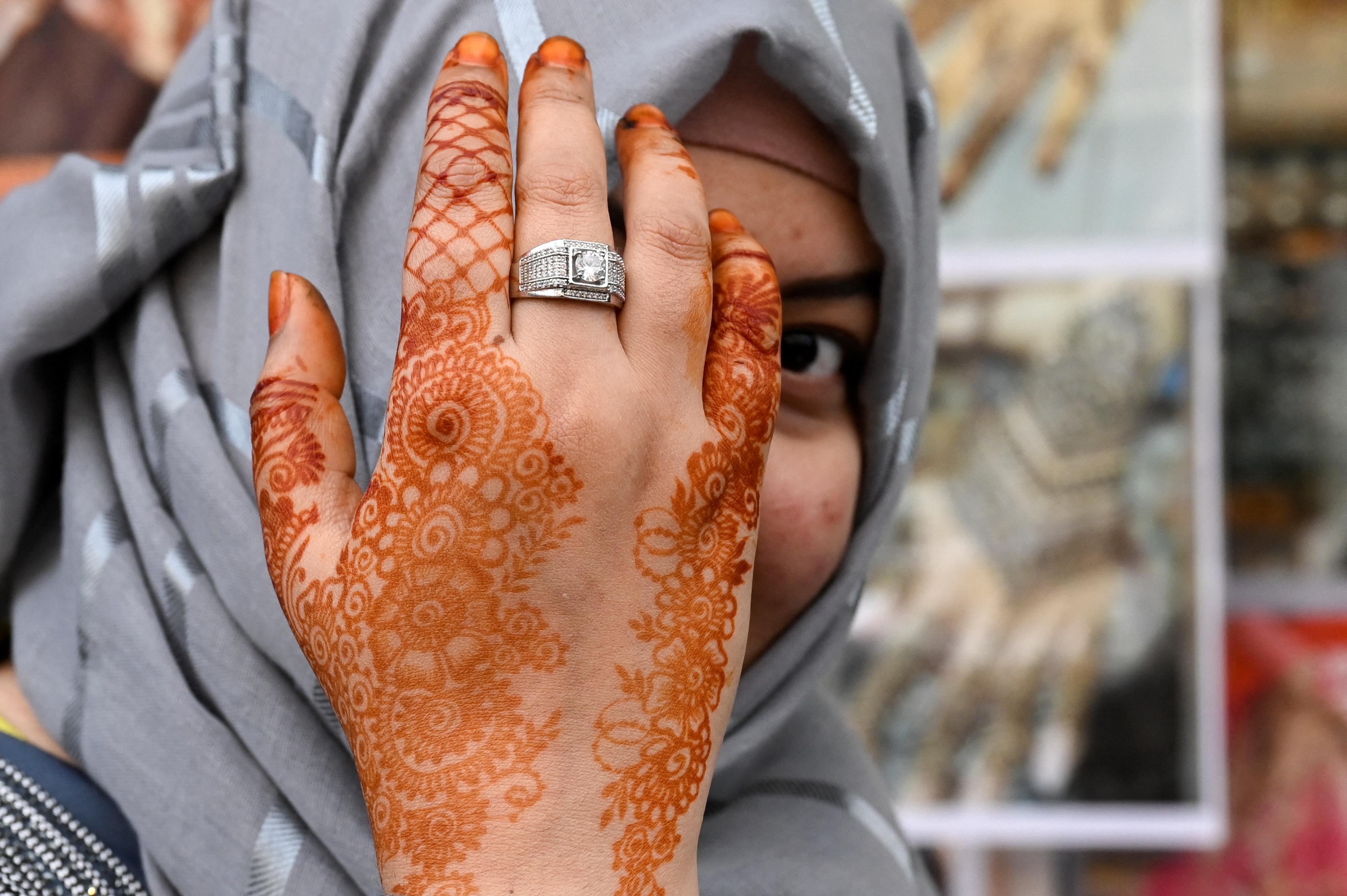 A muslim woman shows her hand painted with henna during Eid al-Fitr, marking the end of the holy month of Ramadan in the suburb of Lakemba in Sydney, Australia on April 21, 2023. (Photo by /Jaimi Joy/Reuters)