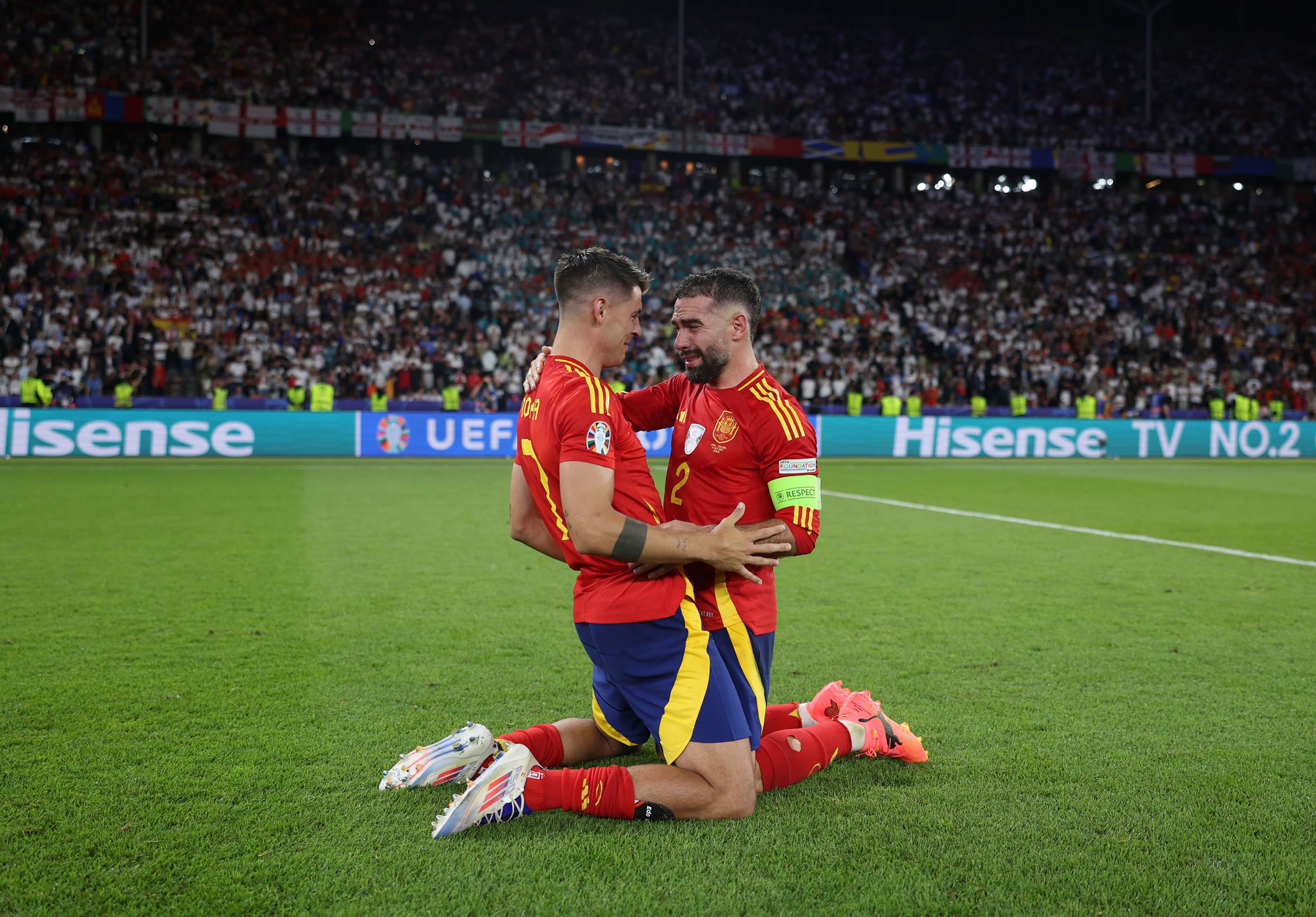Álvaro Morata, left, and Dani Carvajal celebrate after Spain defeated England 2-1 to win its record-breaking fourth European Championship on Sunday, July 14, 2024. (Photo by Alex Pantling/UEFA/Getty Images)