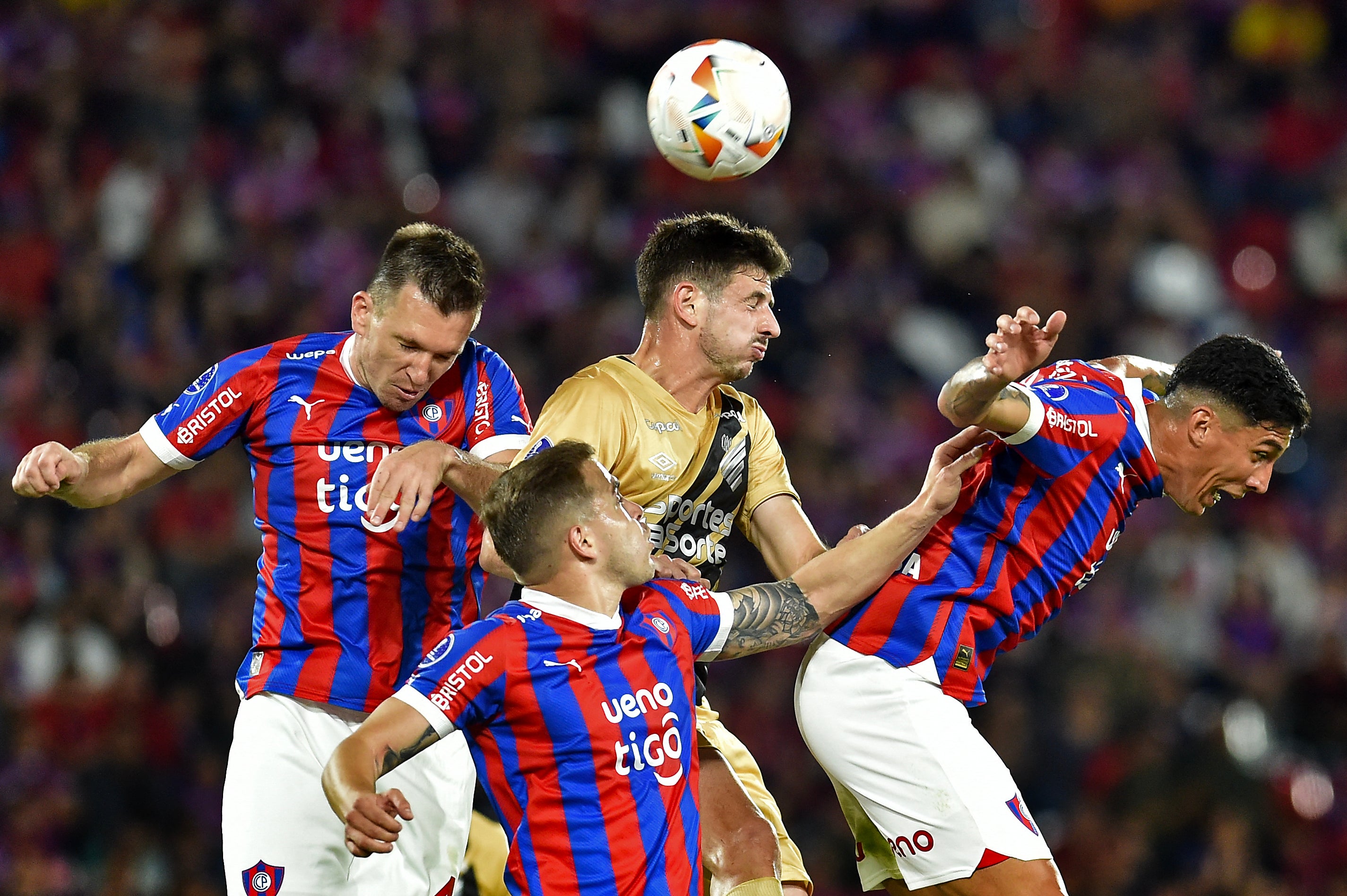 Athletico Paranaense's Argentine forward Lucas Di Yorio (Top-C), Cerro Porteño's Brazilian defender Eduardo Brock, Cerro Porteño's Colombian midfielder Rafael Carrascal and Cerro Porteño's midfielder Enzo Gimenez fight for the ball during the Copa Sudamericana knockout round playoff first leg football match between Paraguay's Cerro Porteno and Brazil's Athletico Paranaense at La Nueva Olla stadium in Asuncion, on July 18, 2024. (Photo by Daniel Duarte/AFP Photo)