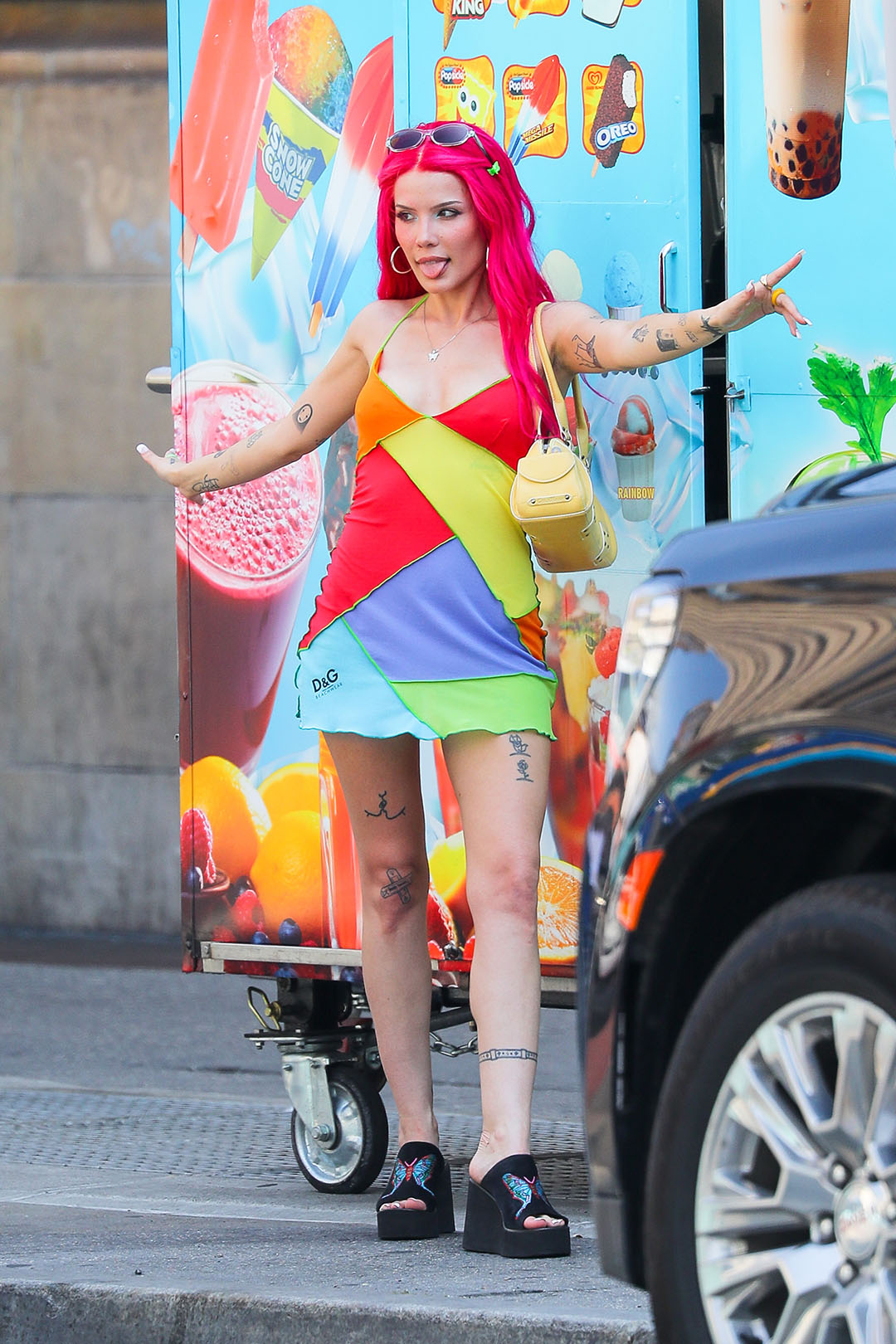 Grammy-nominated singer-songwriter Halsey showcased her vibrant pink hair while shooting a video in a New York City subway station on July 9, 2024. (Photo by Felipe Ramales/Splash News and Pictures)
