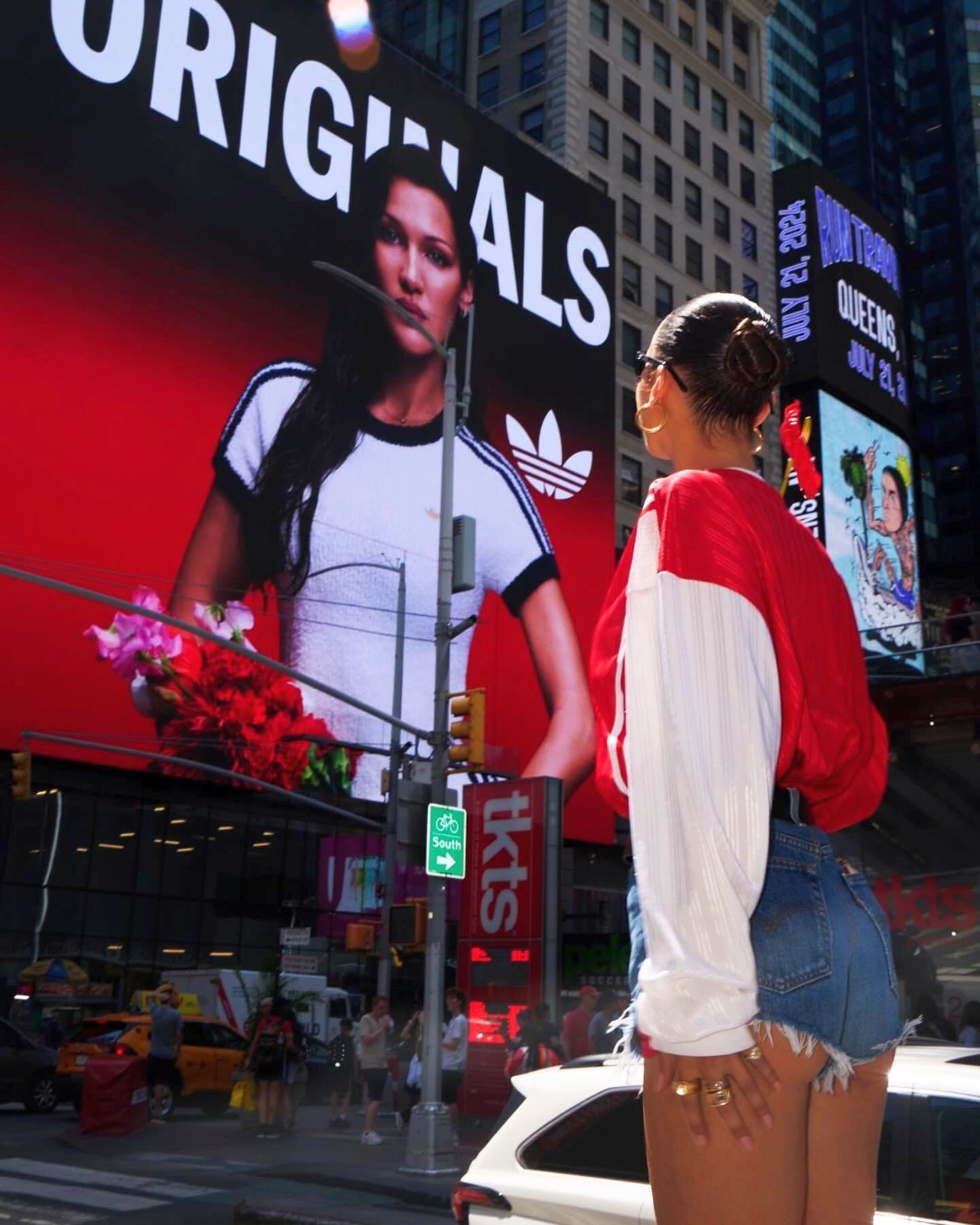 American fashion model Bella Hadid has a “pinch me” moment staring at her Adidas billboard in the second decade of July 2024. (Photo by bellahadid/Instagram)