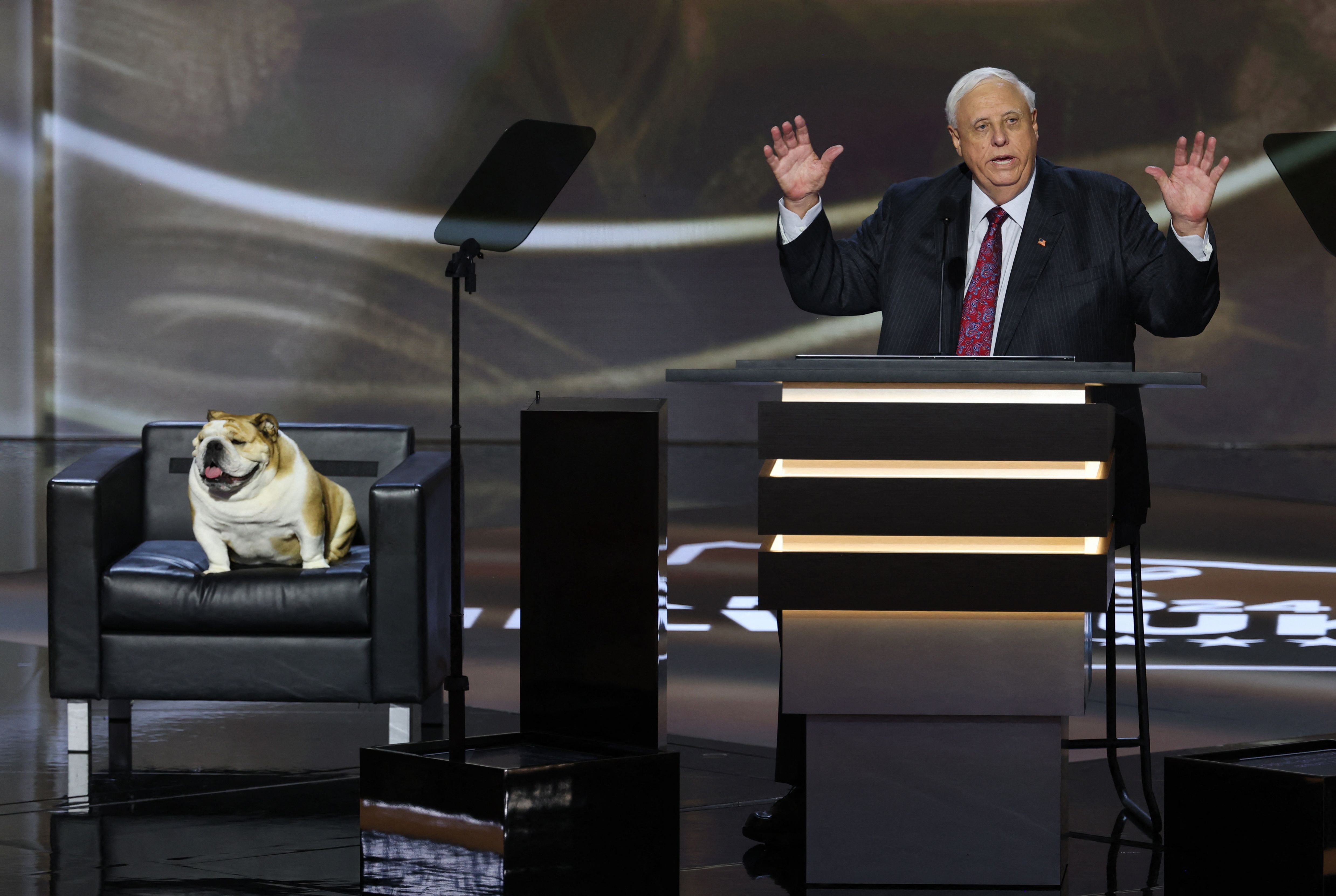 Gov. of West Virginia Jim Justice speaks accompanied by Babydog on Day 2 of the RNC in Milwaukee on July 16, 2024. (Photo by Mike Segar/Reuters)