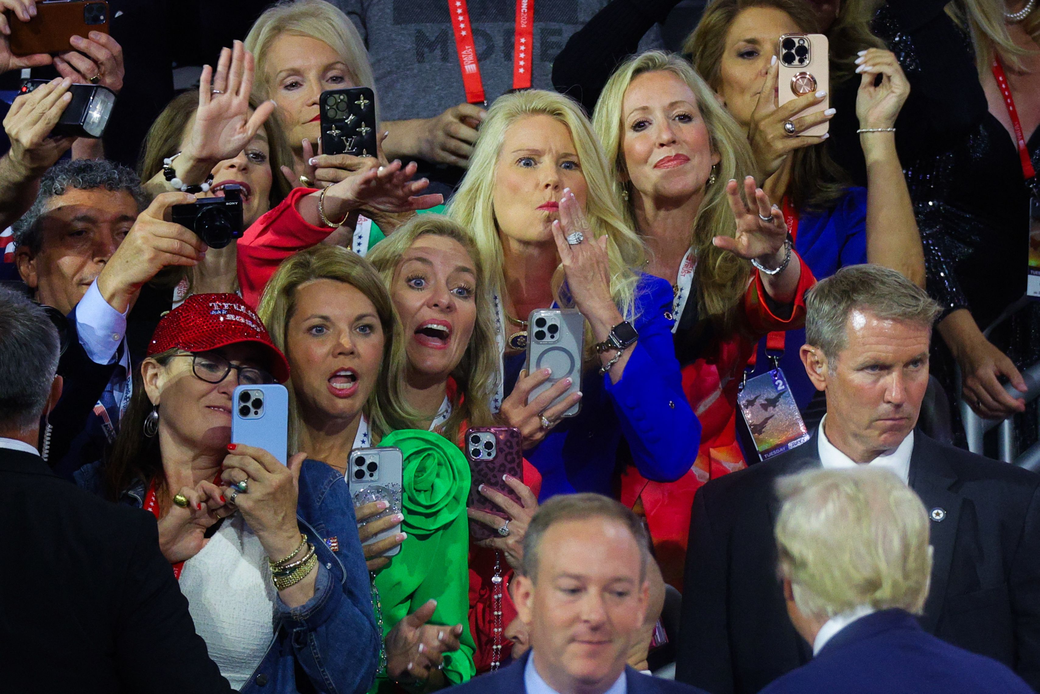 Women take photos and gesture to Donald Trump on Day 2 of the RNC in Milwaukee on July 16, 2024. (Photo by Brian Snyder/Reuters)