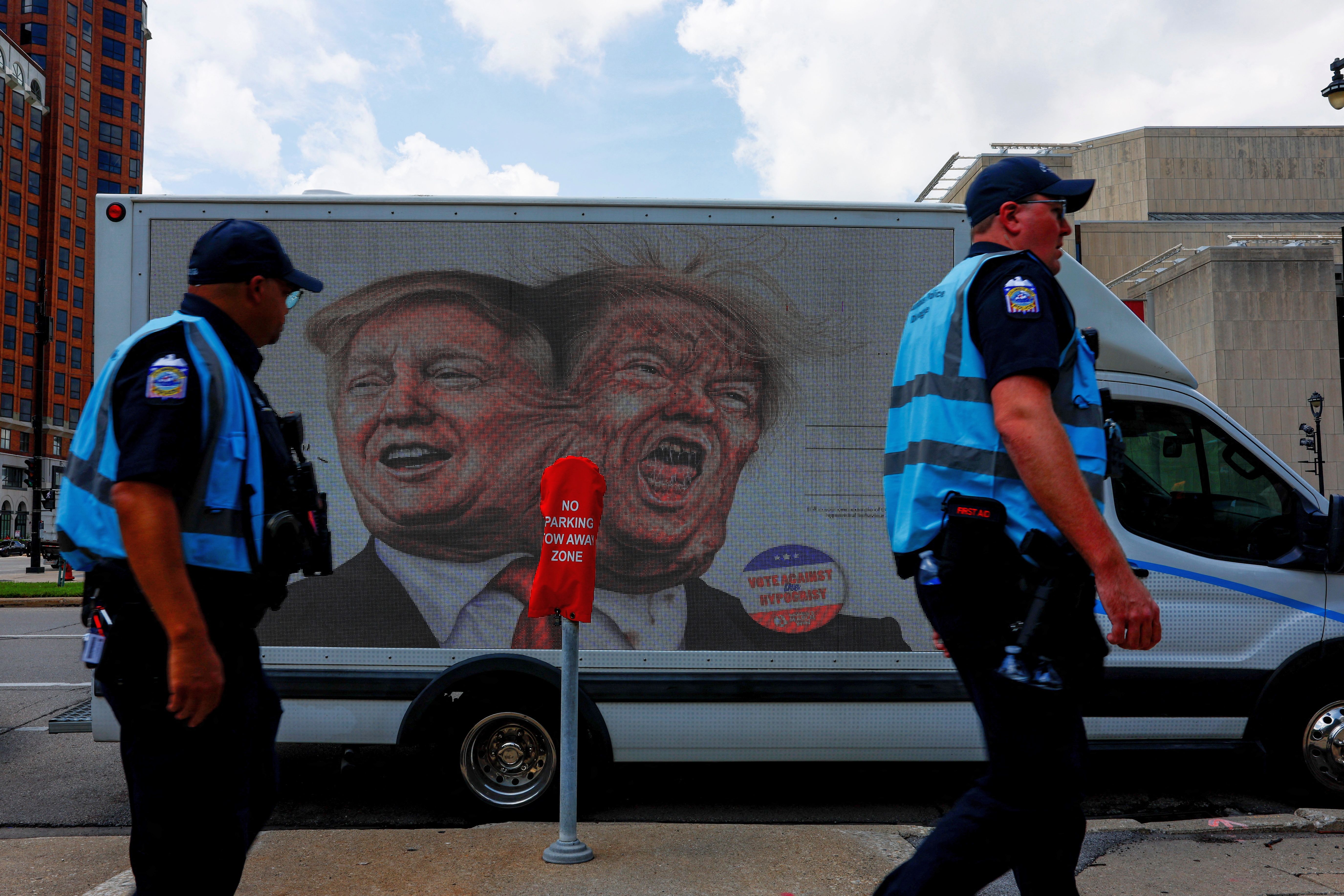 People walk next to a van with images of former President Donald Trump, as demonstrators and members of the Coalition to March on the RNC hold a rally in Milwaukee, Wisconsin on July 15, 2024. (Photo by Evelyn Hockstein/Reuters)