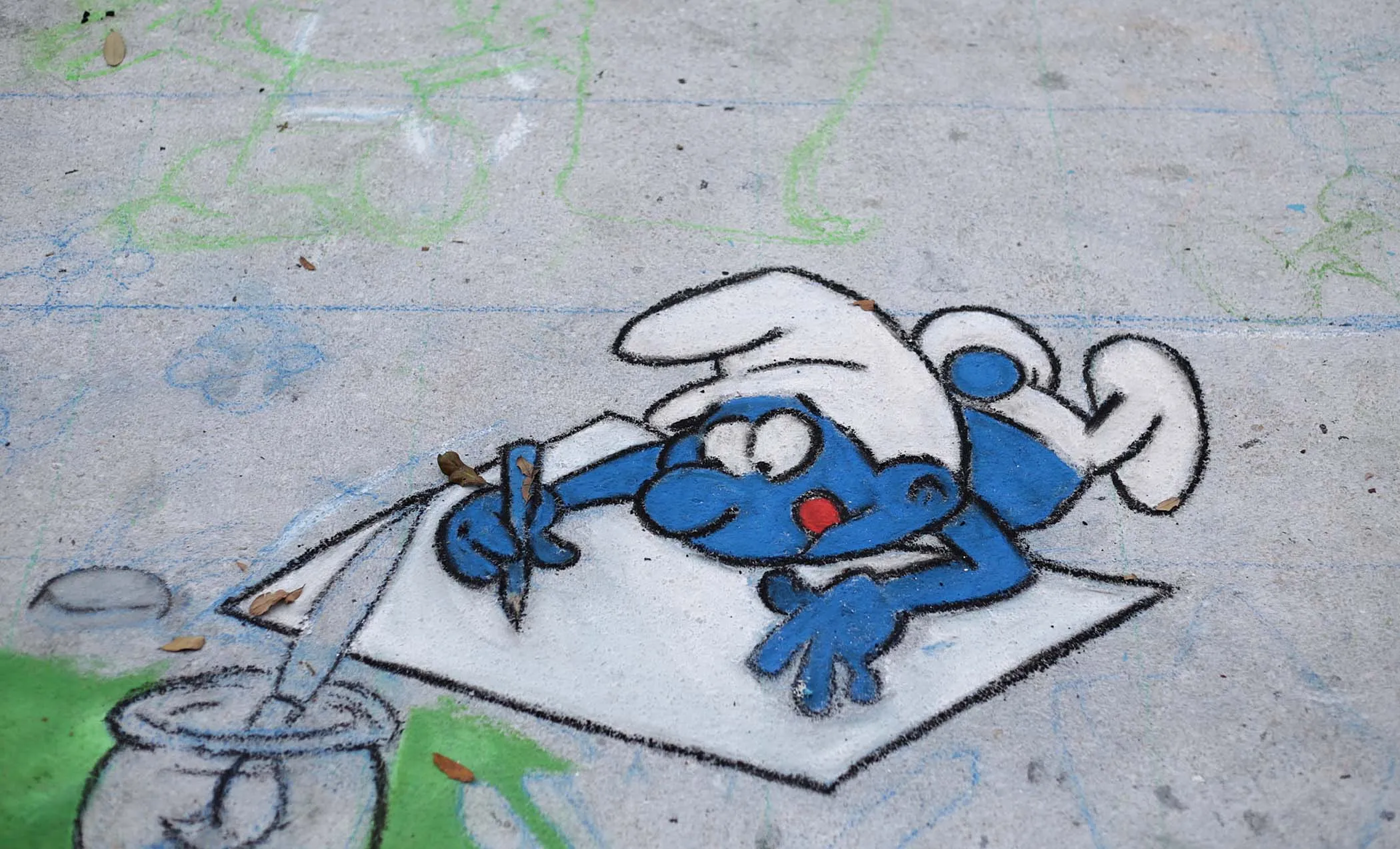 The beginnings of a Smurf-themed chalk drawing takes shape on Saturday. (Photo by Thomas Cordy/The Palm Beach Post)