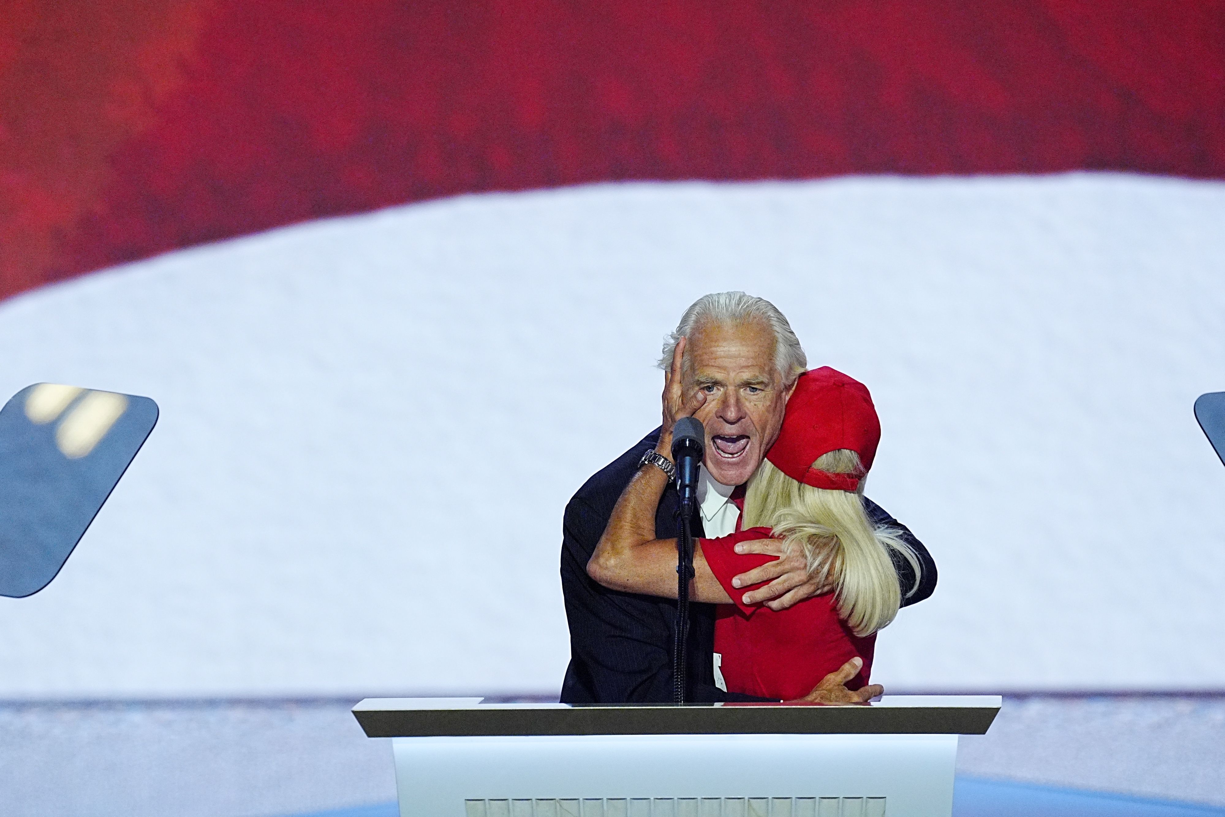 Former Trump adviser Peter Navarro hugs his fiancée as he speaks to the delegates during the third day of Republican National Convention at the Fiserv Forum in Milwaukee, Wisconsin, United States, on July 17, 2024. (Photo by Melina Mara/The Washington Post)