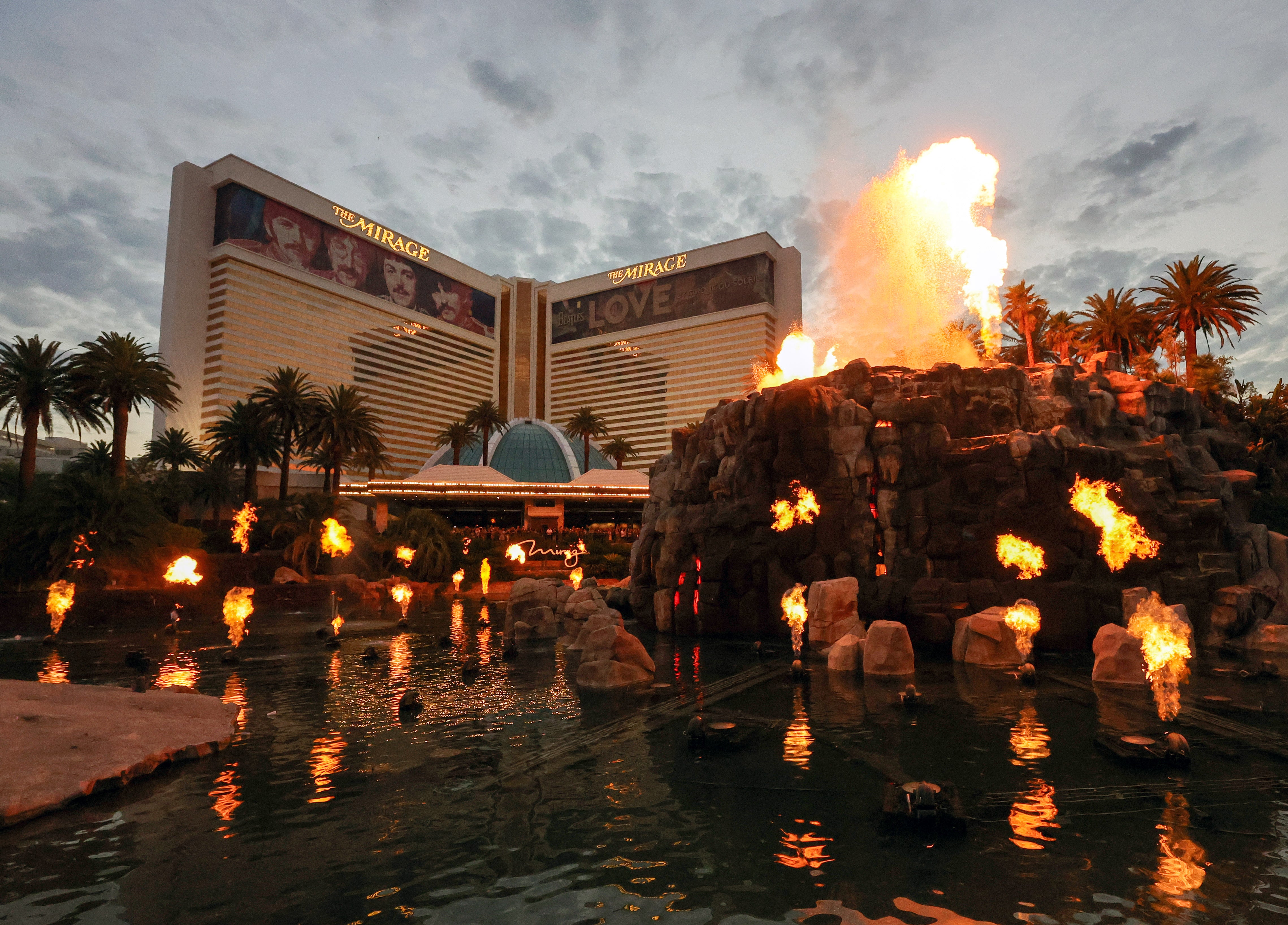 The volcano attraction in front of The Mirage Hotel & Casino erupts on July 16, 2024, in Las Vegas, Nevada. Hard Rock International (HRI) will close the resort on July 17, 2024, to begin a construction project to transform the property into the Hard Rock Hotel & Casino and Guitar Hotel Las Vegas by 2027. HRI purchased the resort, which opened in 1999 for USD 630 million as the first megaresort on the Las Vegas Strip, from MGM Resorts International in 2021 for USD 1.075 billion in cash. (Photo by Ethan Miller/Getty Images)