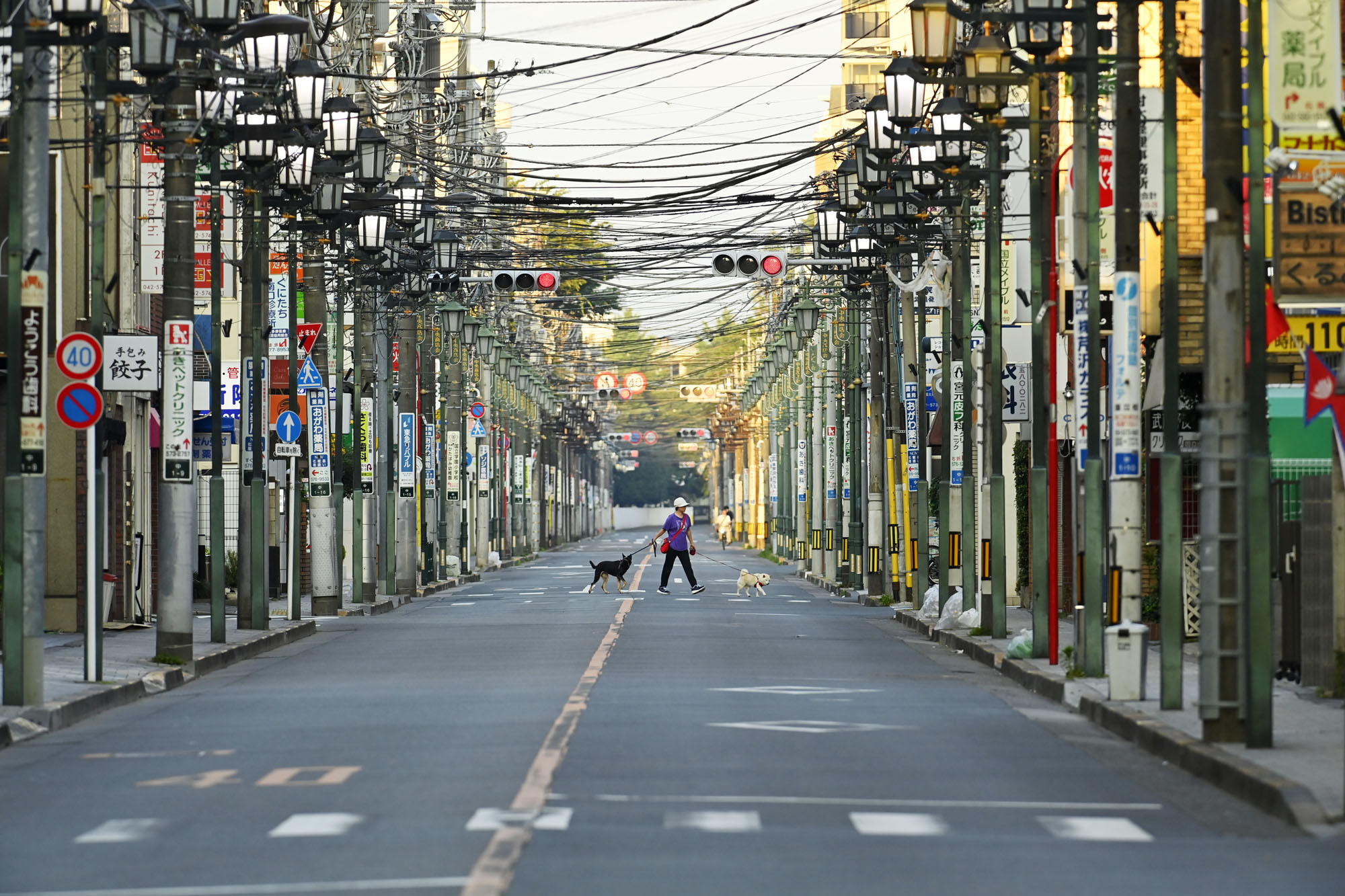 A woman walks her dogs very early in the morning on the street before the heat of the day sets in on June 14, 2024 in Tokyo, Japan. Tokyo is swept by intense heat. The Kanto region experiences the first days of summer with temperatures above 30 degrees Celsius, with the highest temperature in central Tokyo reaching over 30 degrees. (Photo by David Mareuil/Anadolu via Getty Images)